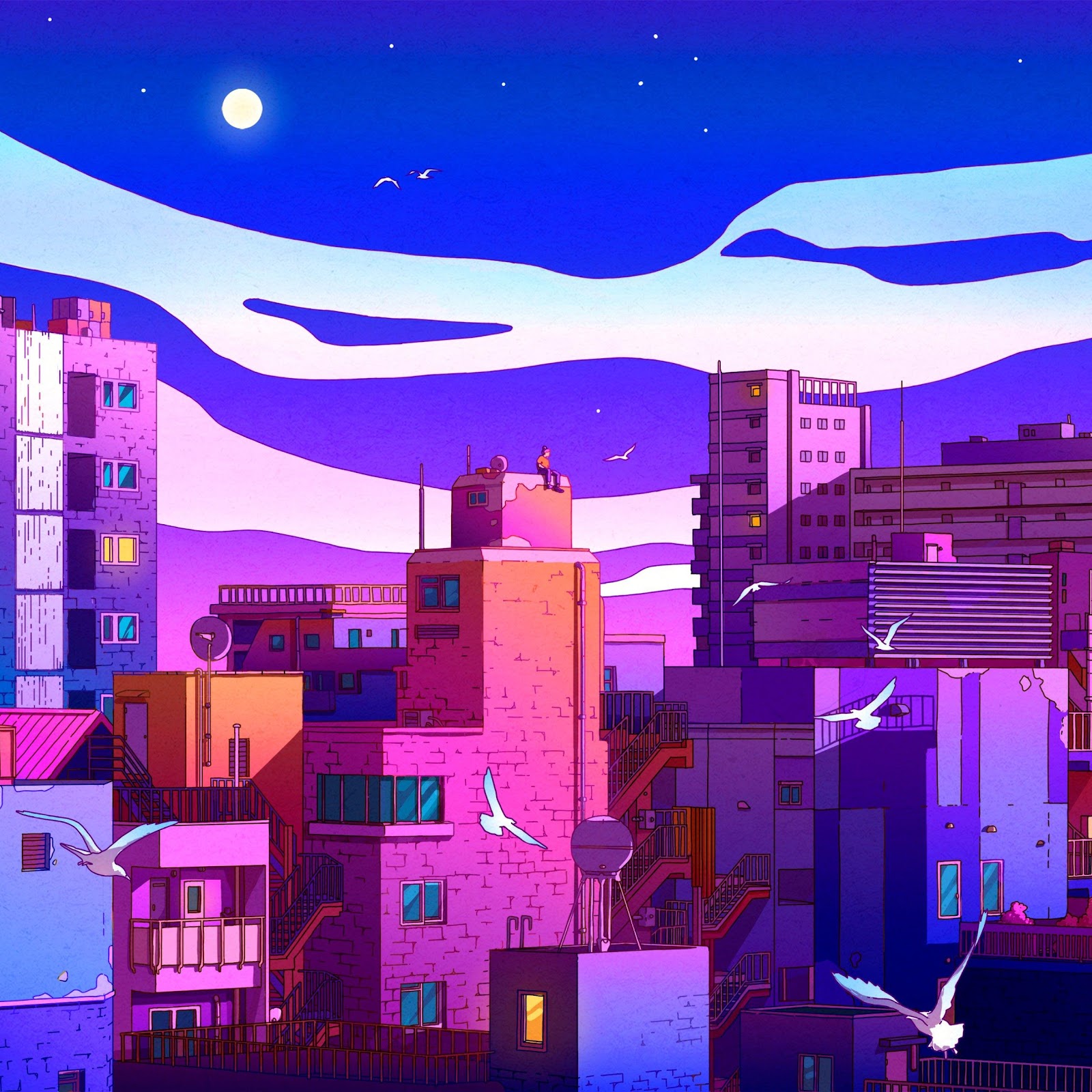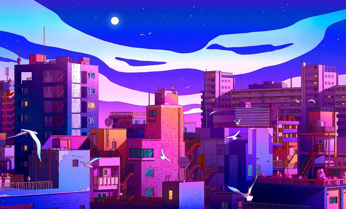 A vibrant cityscape with blocky buildings glows under a bright moonlit sky with vivid purple and blue vaporwave colors.