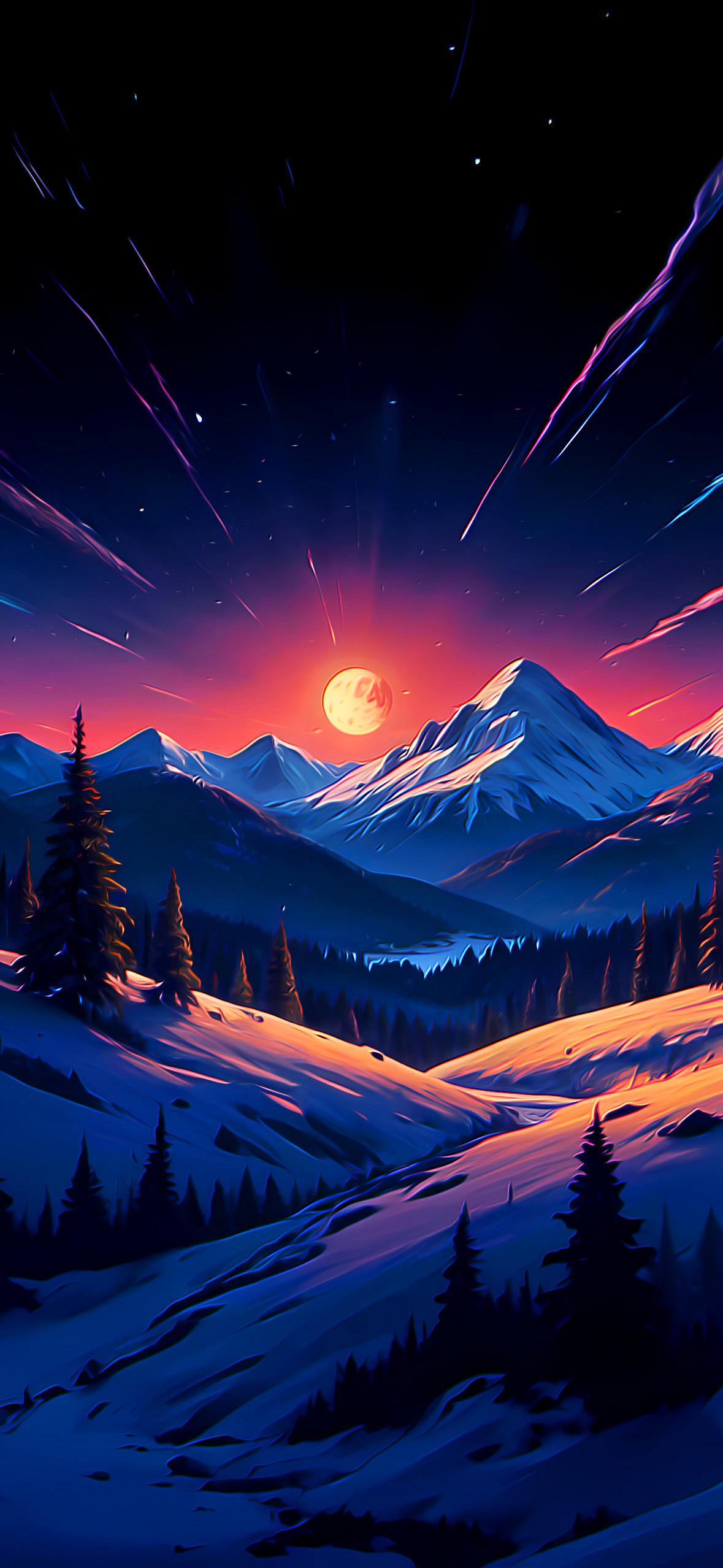 Vibrant Winter Mountain Nightscape Full HD iPhone Wallpaper A dramatic red and orange full moon shines brightly over snow-covered mountains and evergreen trees in a vibrant digital art style. en596 209.82 KB 1179x2556 Download original File Size: Dimensions: Resolution: Full HD Format: Mobile ID: Blue Cosmic Digital Painting Full Moon Nightscape Snowy Mountains Winter