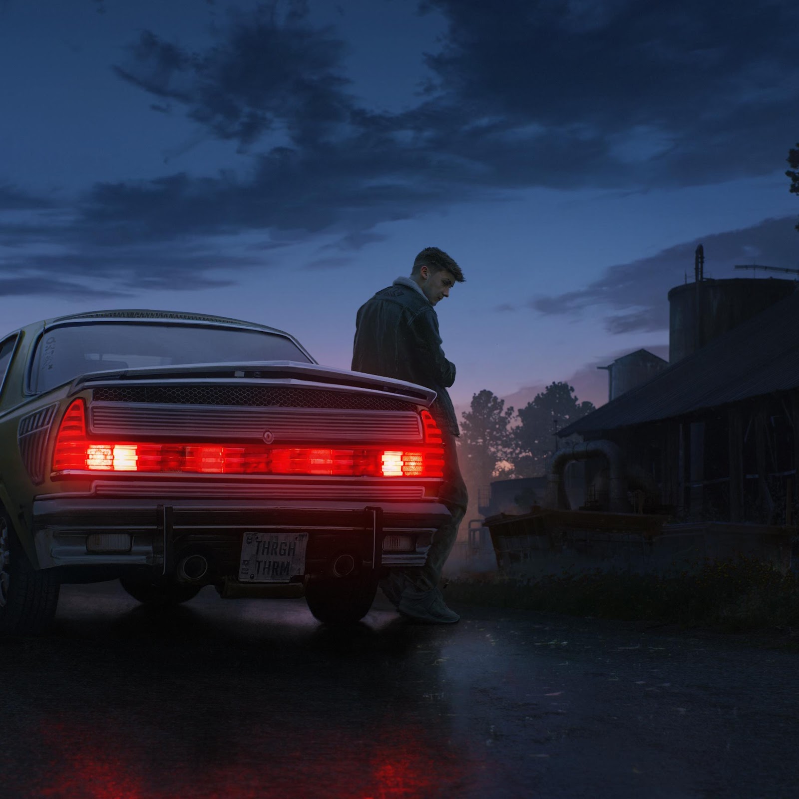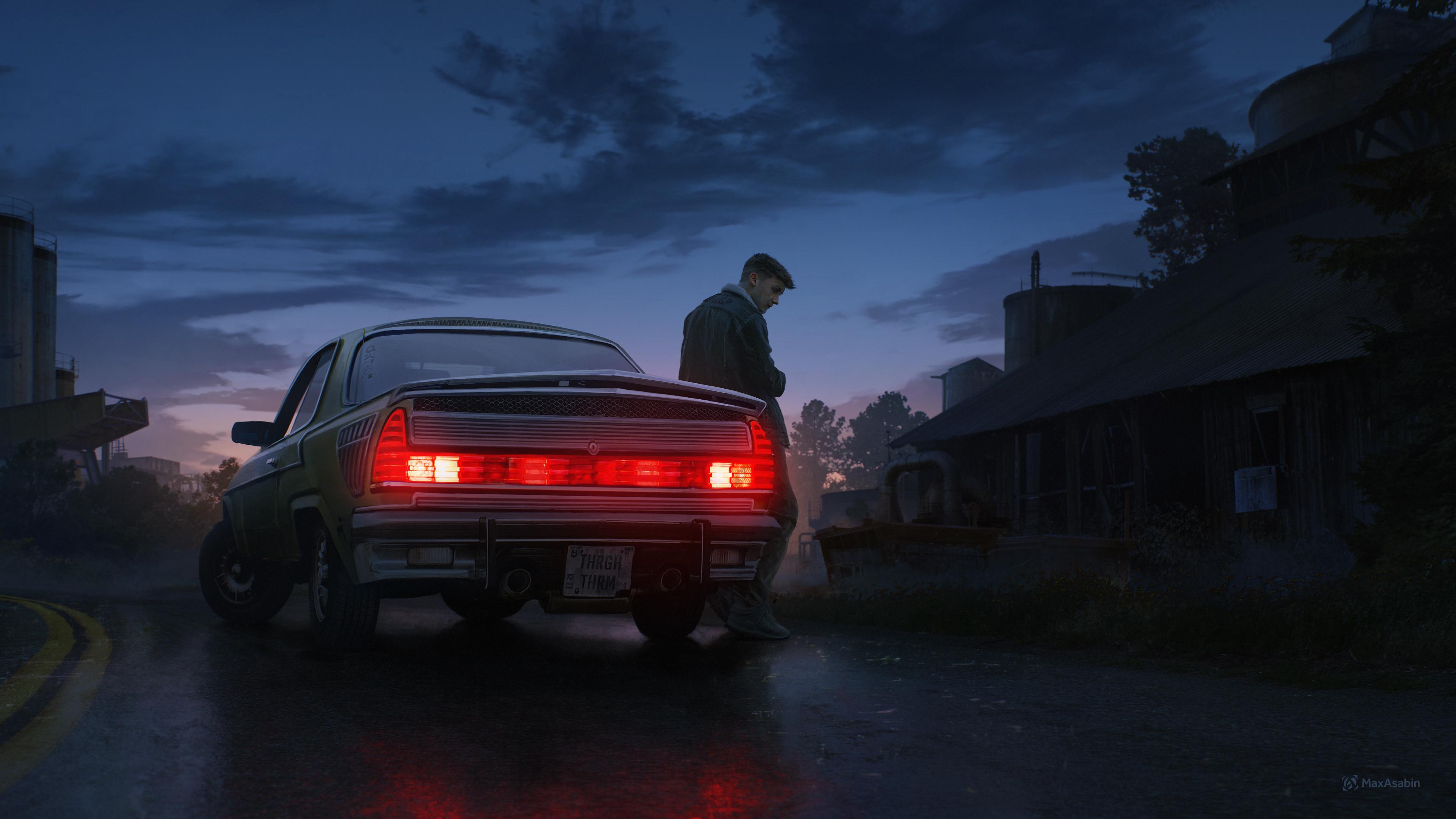 Vintage Car, Night Scene, Industrial Landscape, Solitary Figure 4K Desktop and Mobile Wallpaper Background with a maximum resolution of 3840x2160 px.