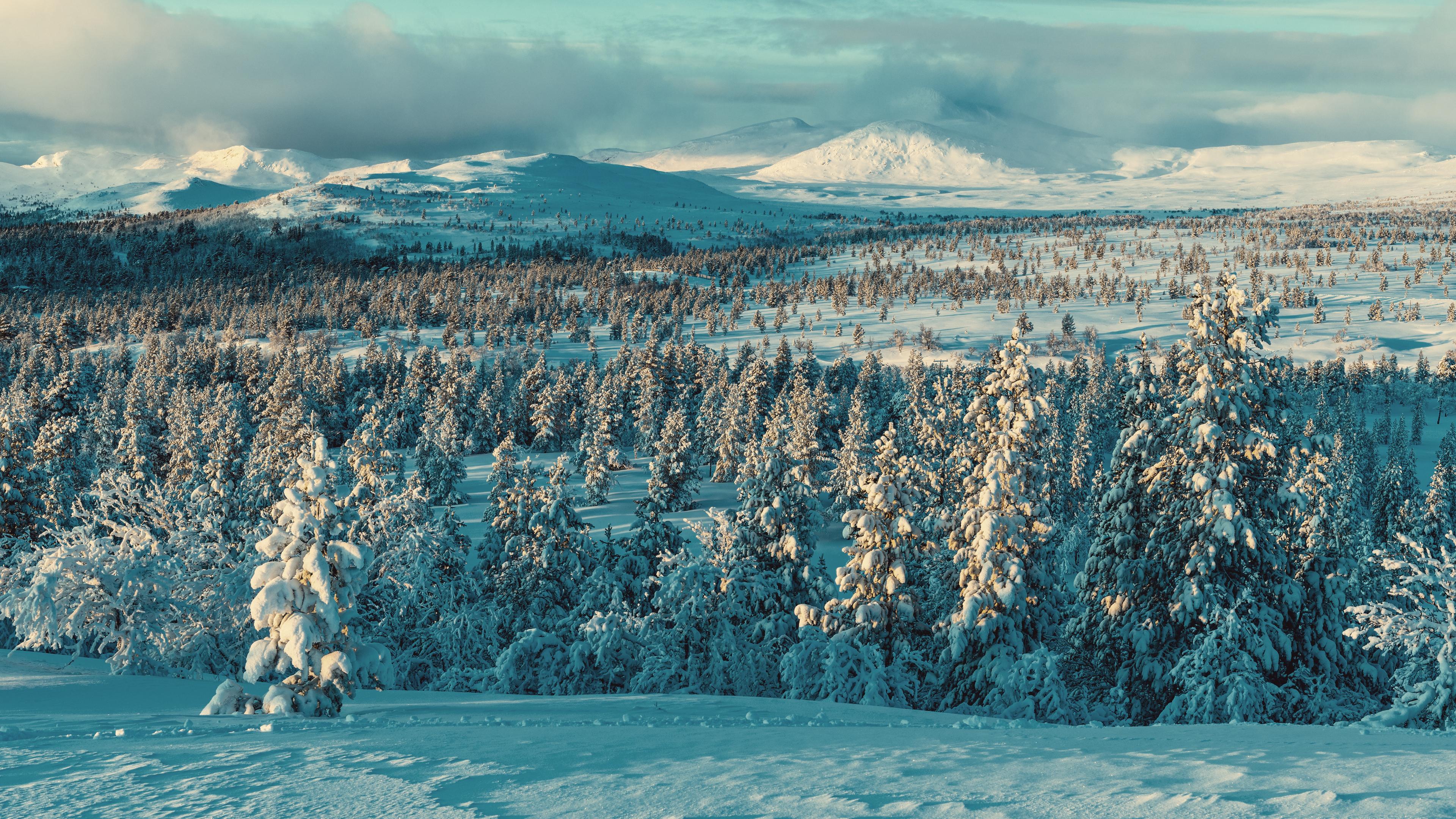 Winter Landscape, Snowy Forest, Mountain Scenery, Evergreen Trees 4K Wallpaper Background (3840x2160)
