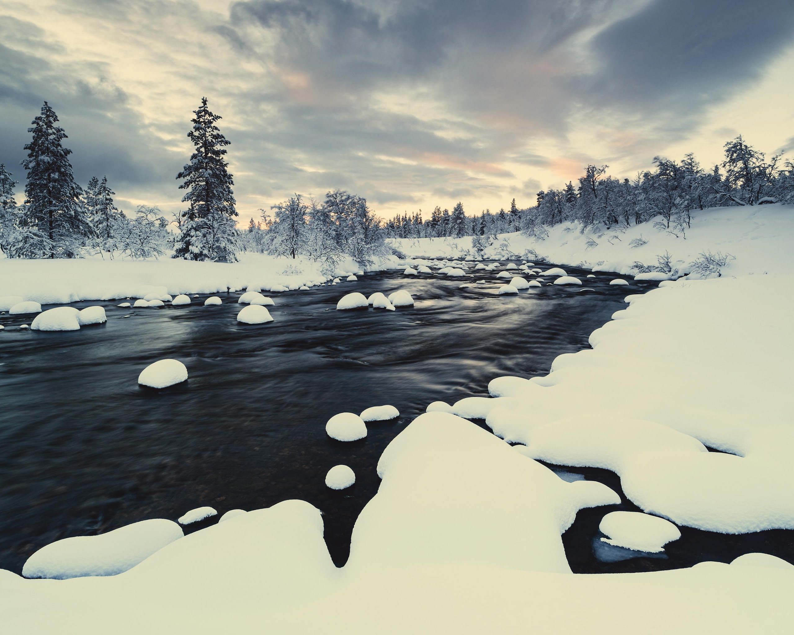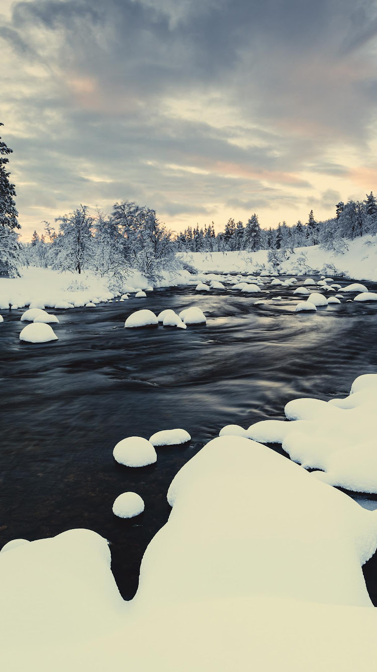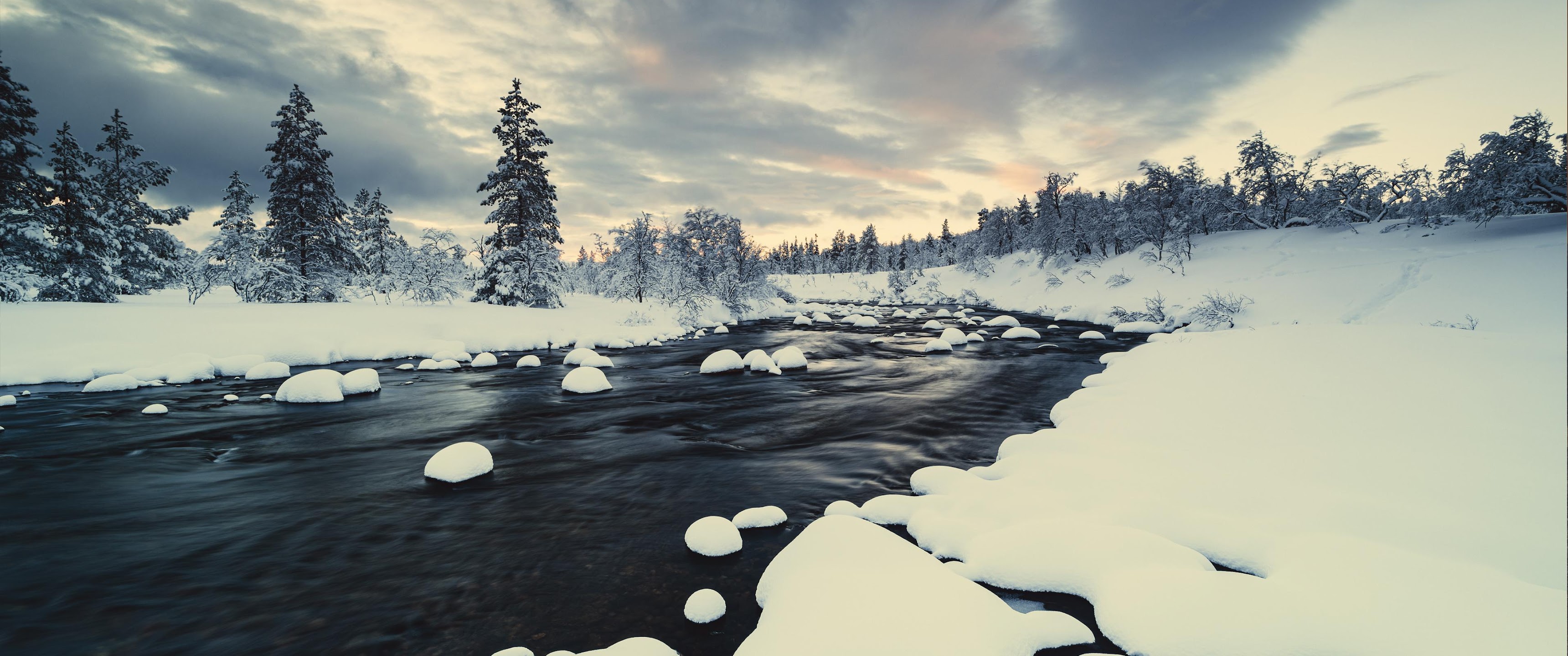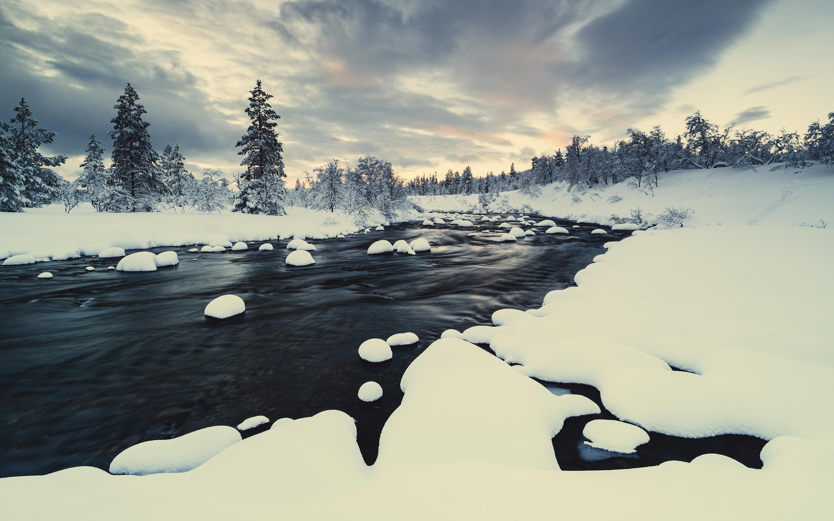 Winter Landscape, Snowy River, Forest Winter, Nordic Scenery 4K Desktop and Mobile Wallpaper Background with a maximum resolution of 3840x2160 px.