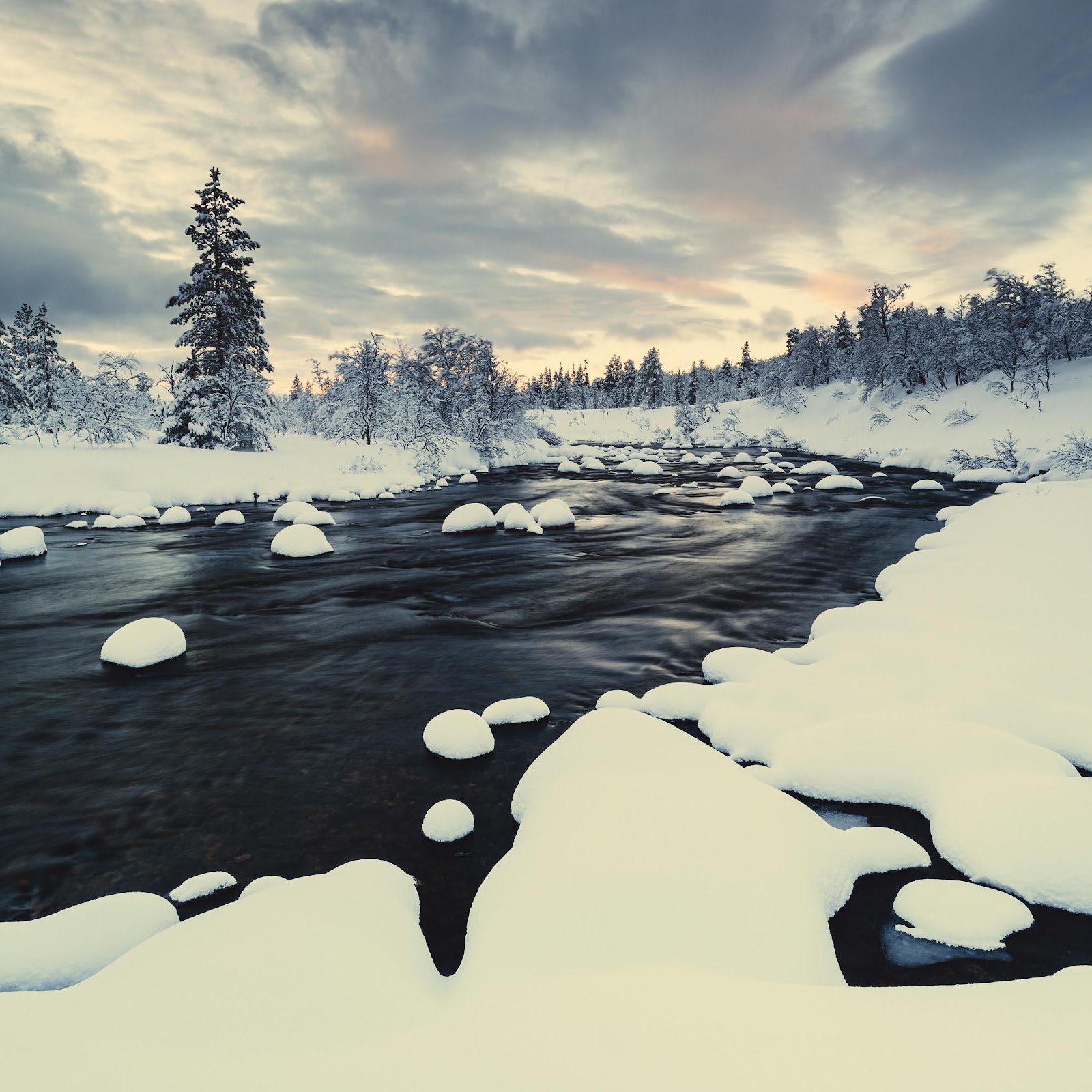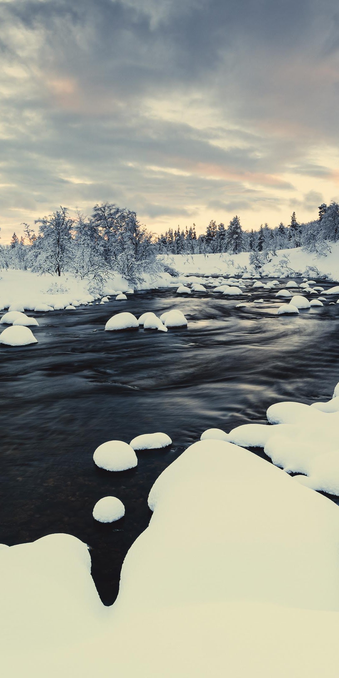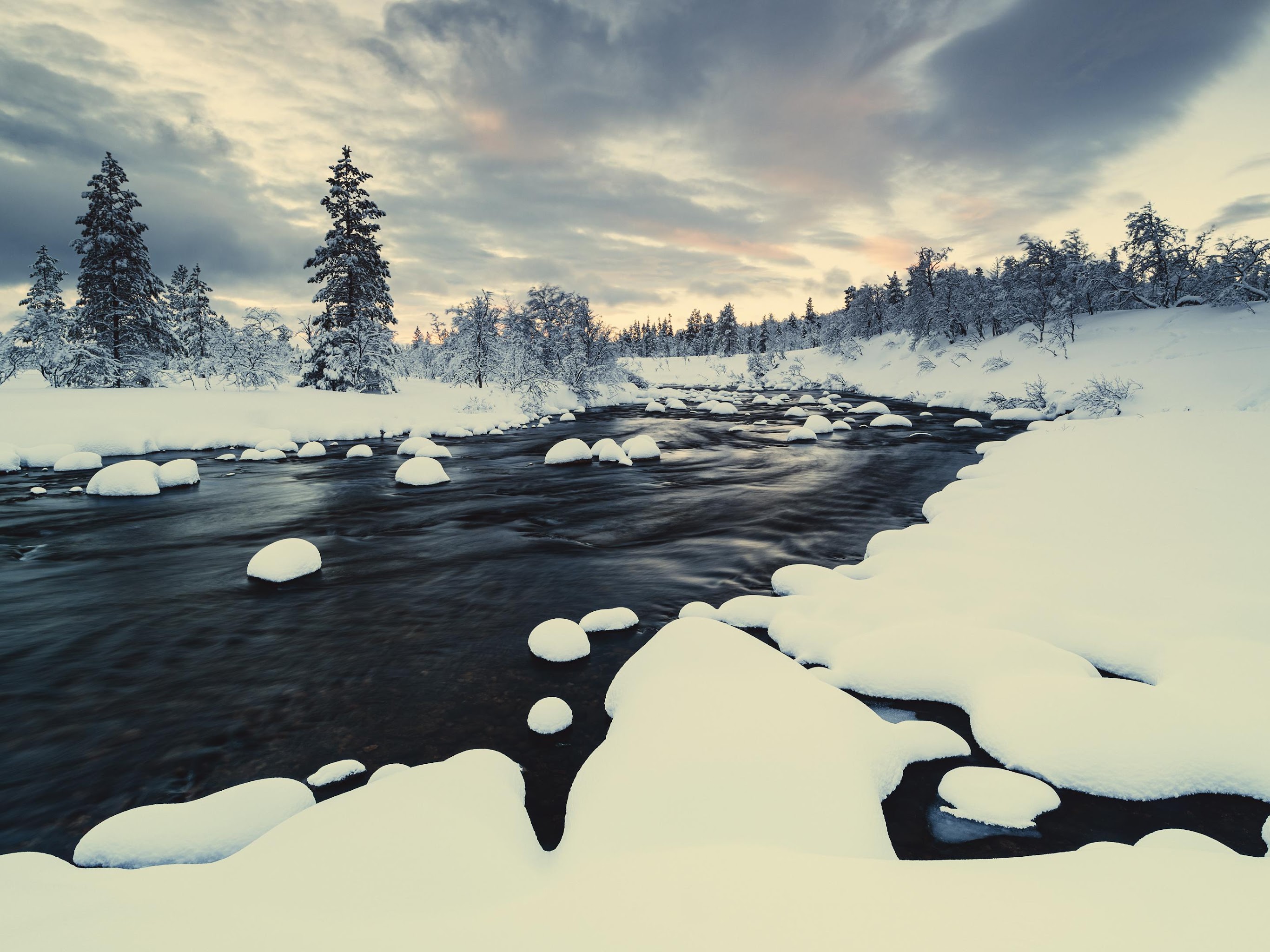 Winter Landscape, Snowy River, Forest Winter, Nordic Scenery 4K Desktop and Mobile Wallpaper Background with a maximum resolution of 3840x2160 px.