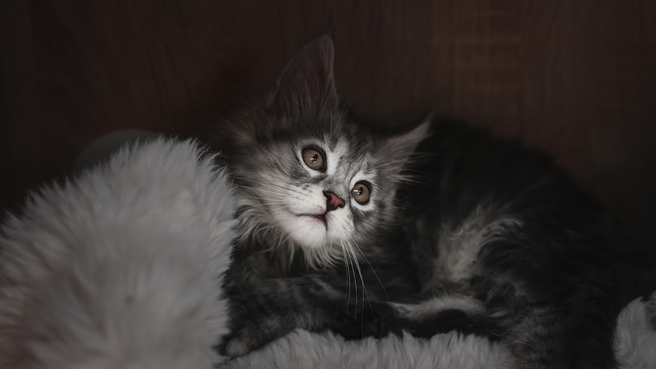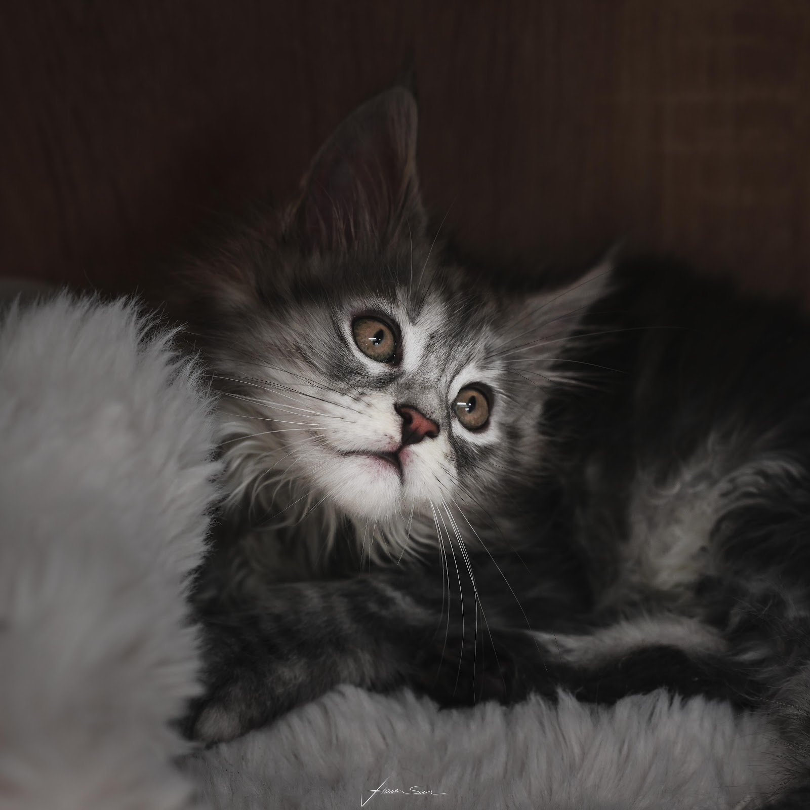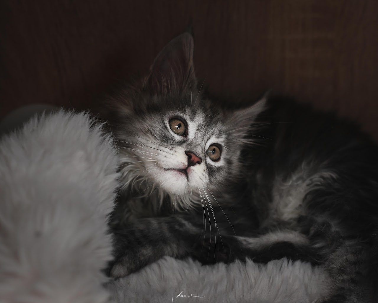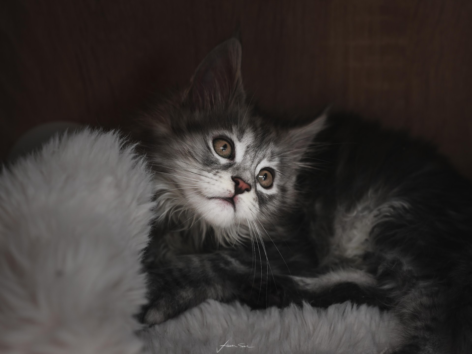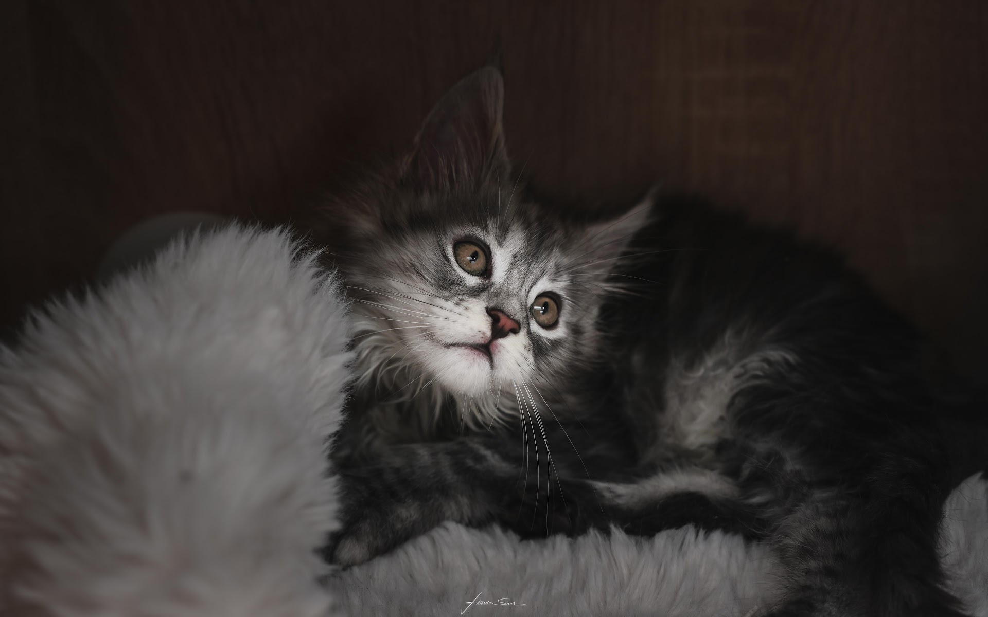 A fluffy Maine Coon kitten with large amber eyes is resting on a soft white blanket in a dark, intimate portrait.