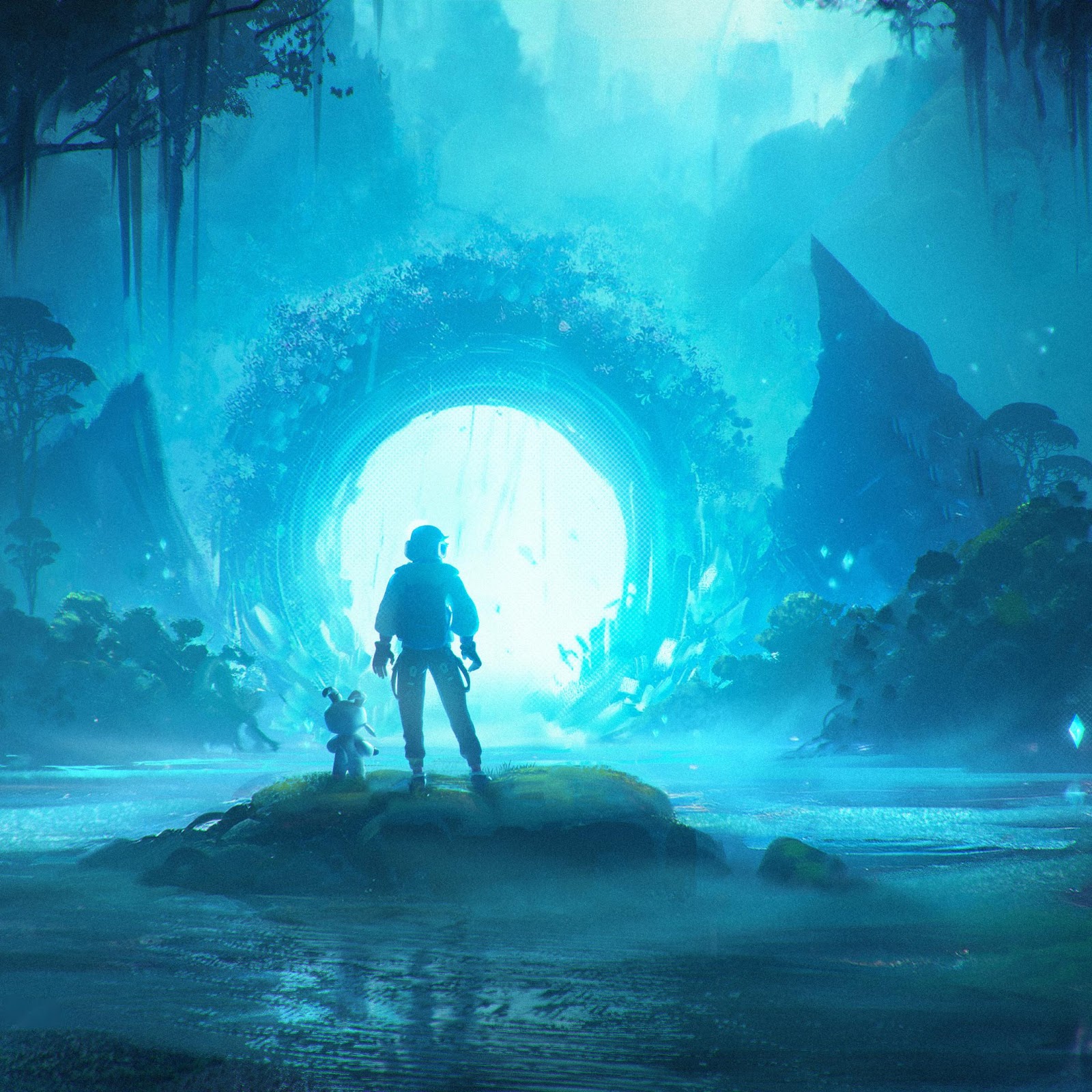 The silhouette of an adventurer and their small companion stand on a rock facing a huge luminous blue portal in a dark, mysterious forest setting.