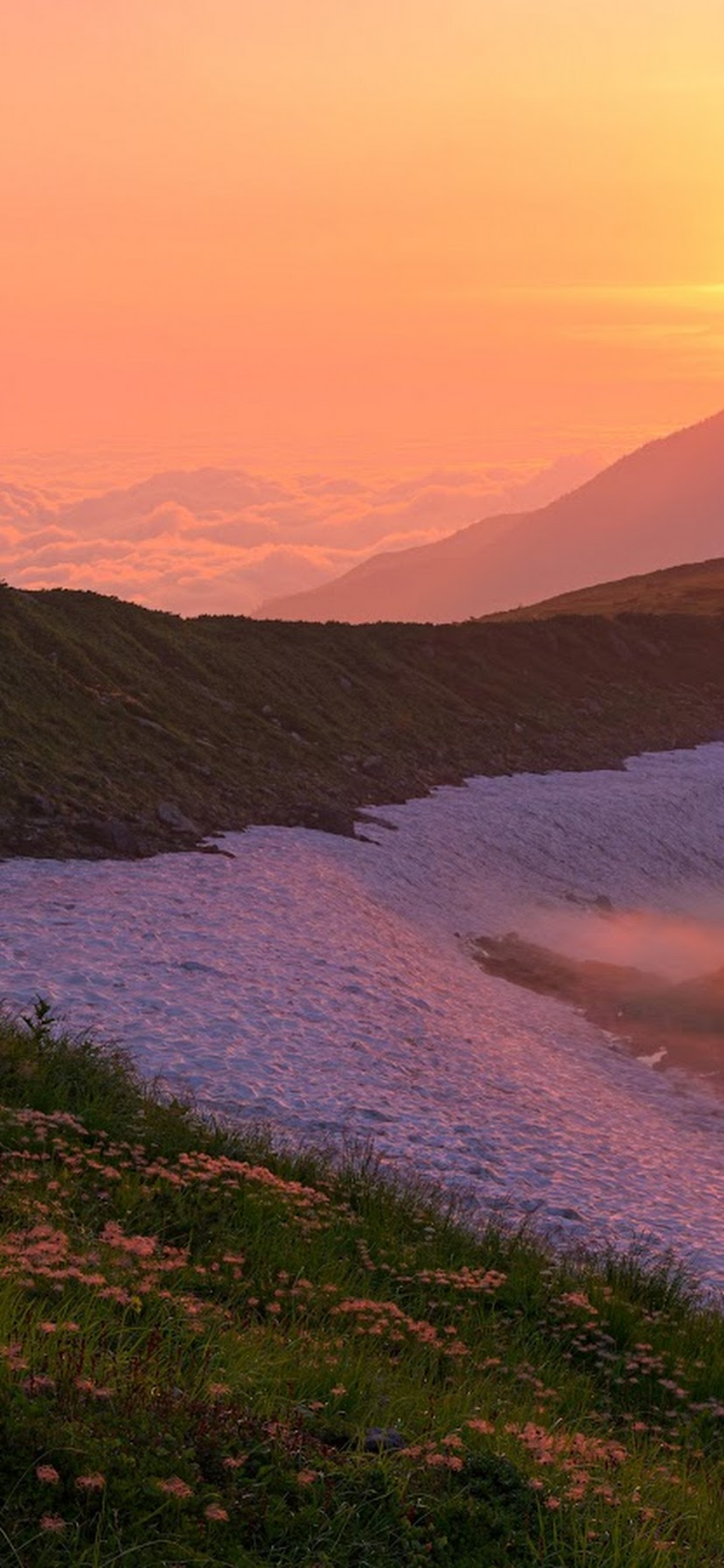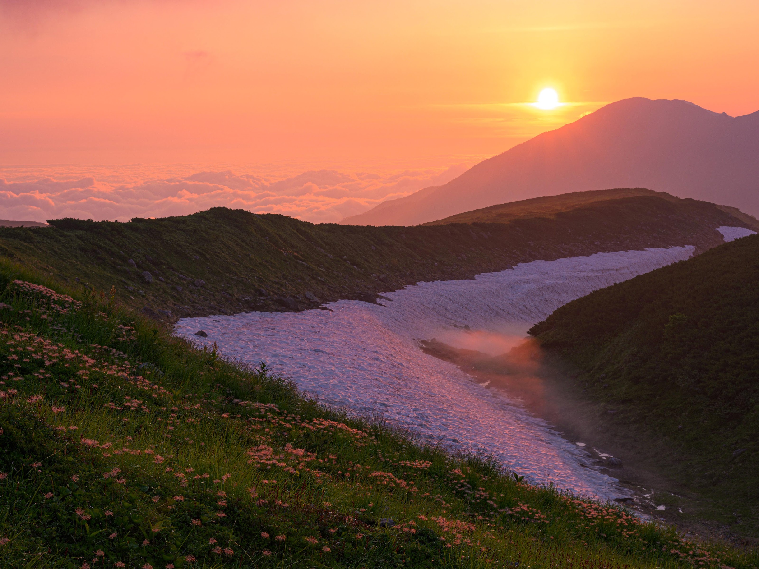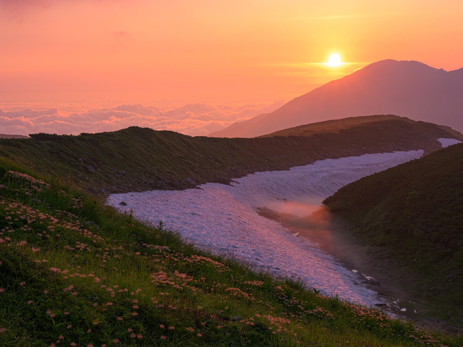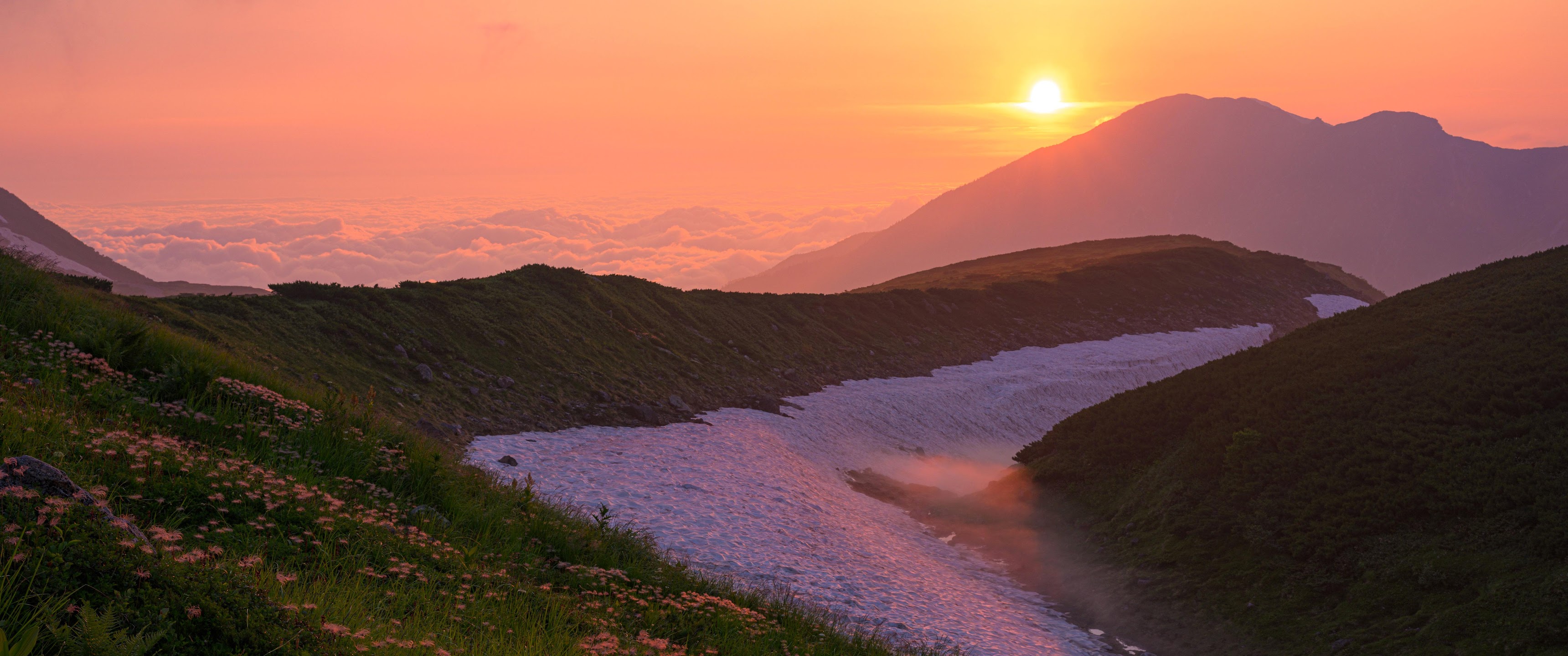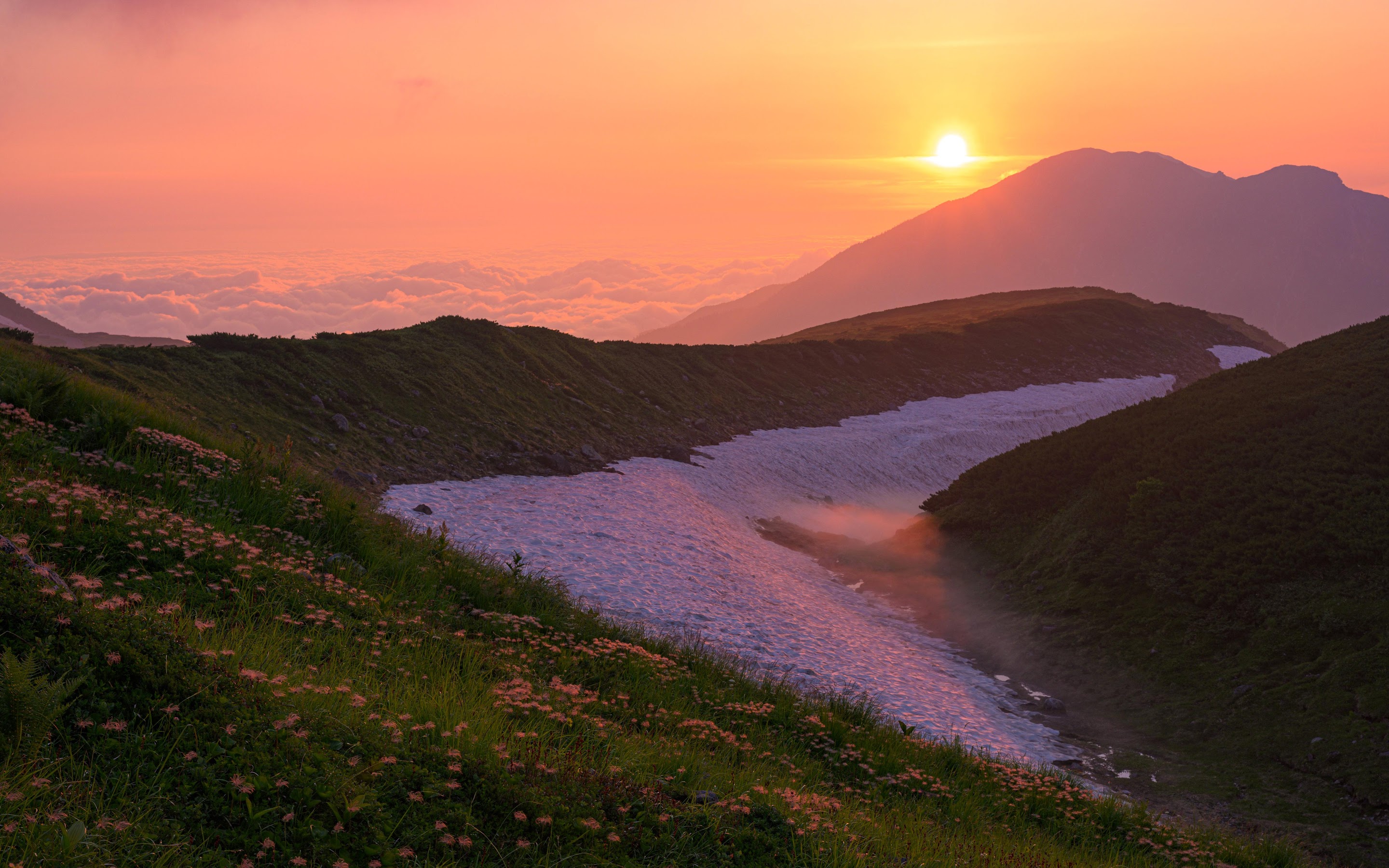 A majestic mountain landscape shows deep green alpine meadows and snow patches under a dramatic pink and orange sunset sky.