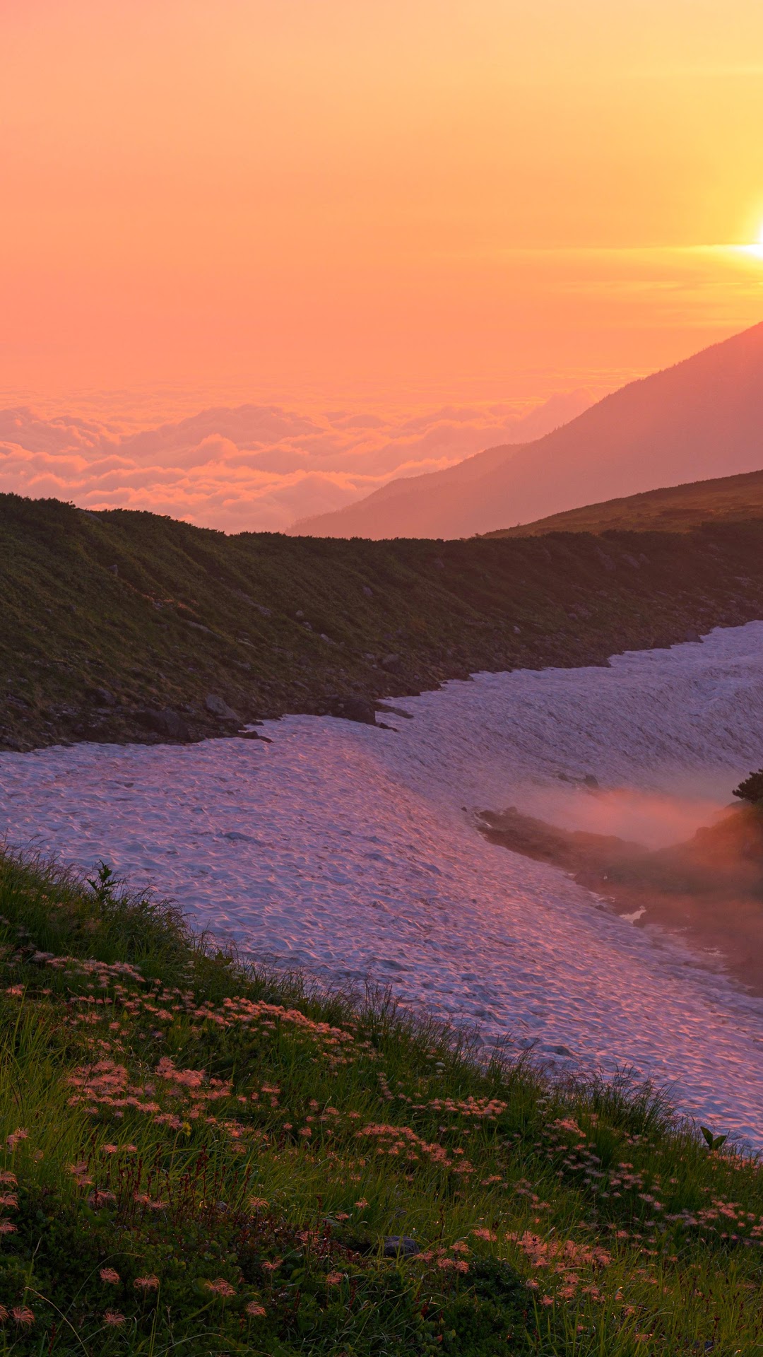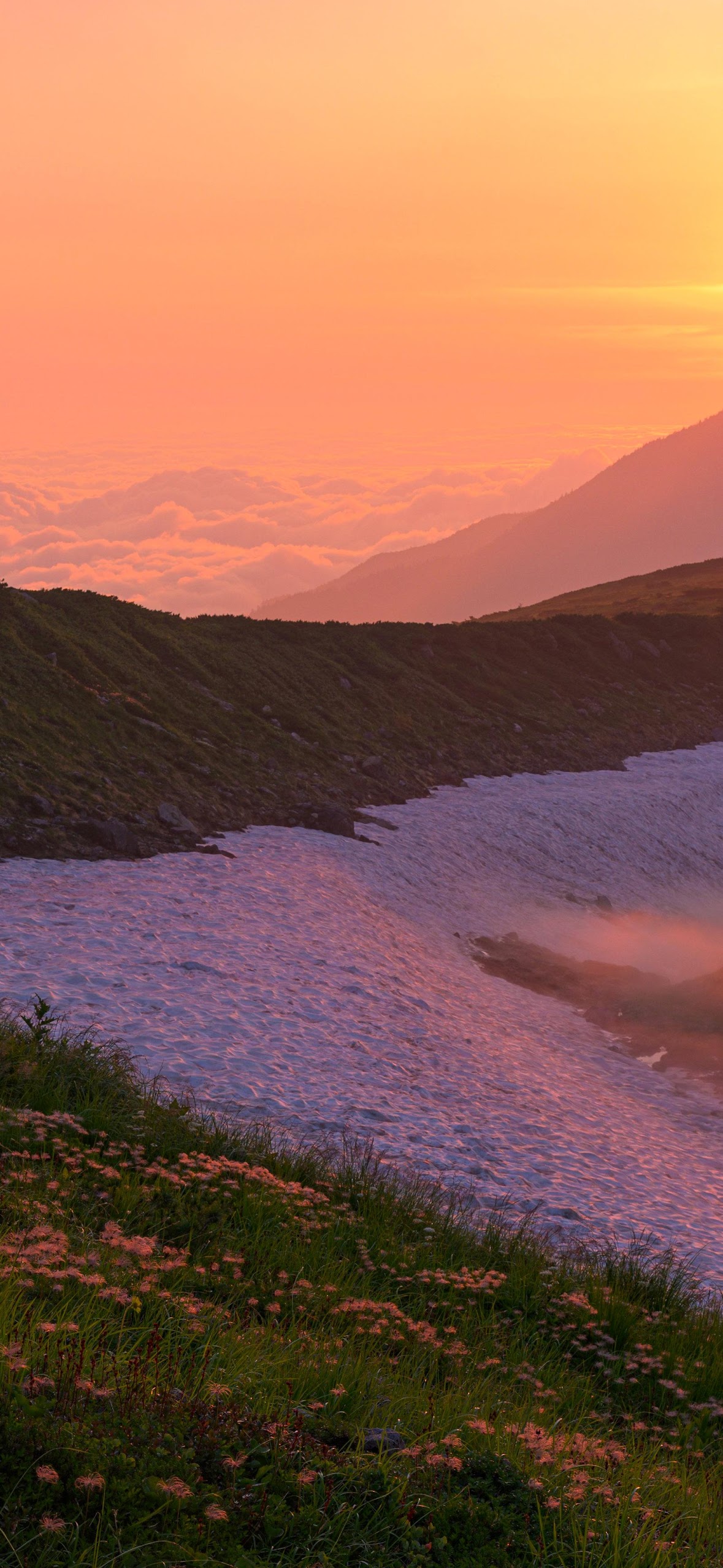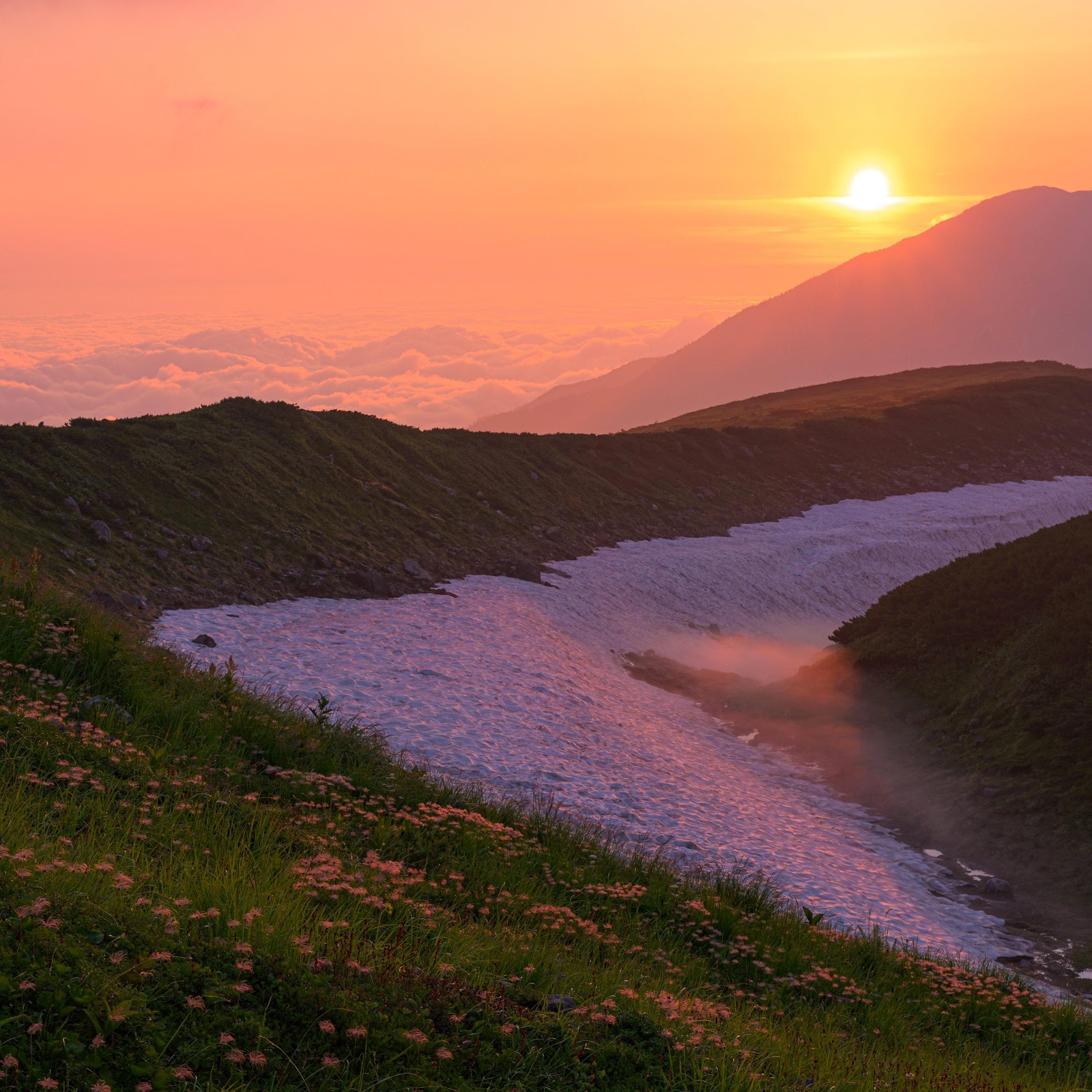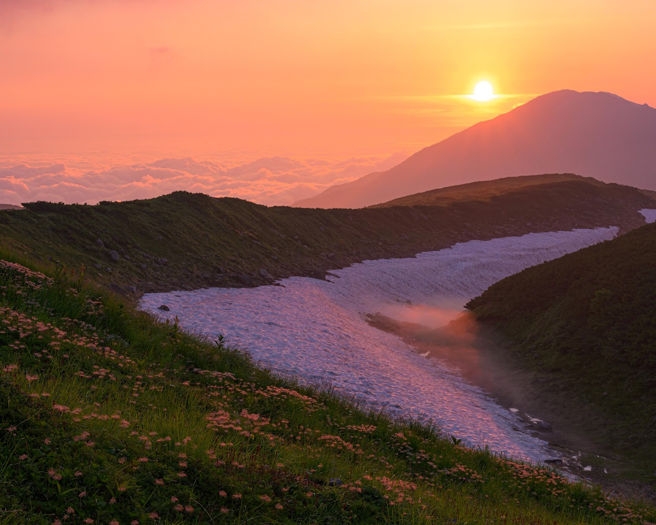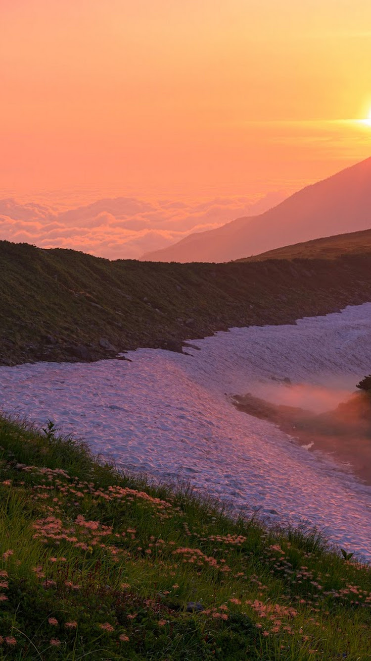 A majestic mountain landscape shows deep green alpine meadows and snow patches under a dramatic pink and orange sunset sky.