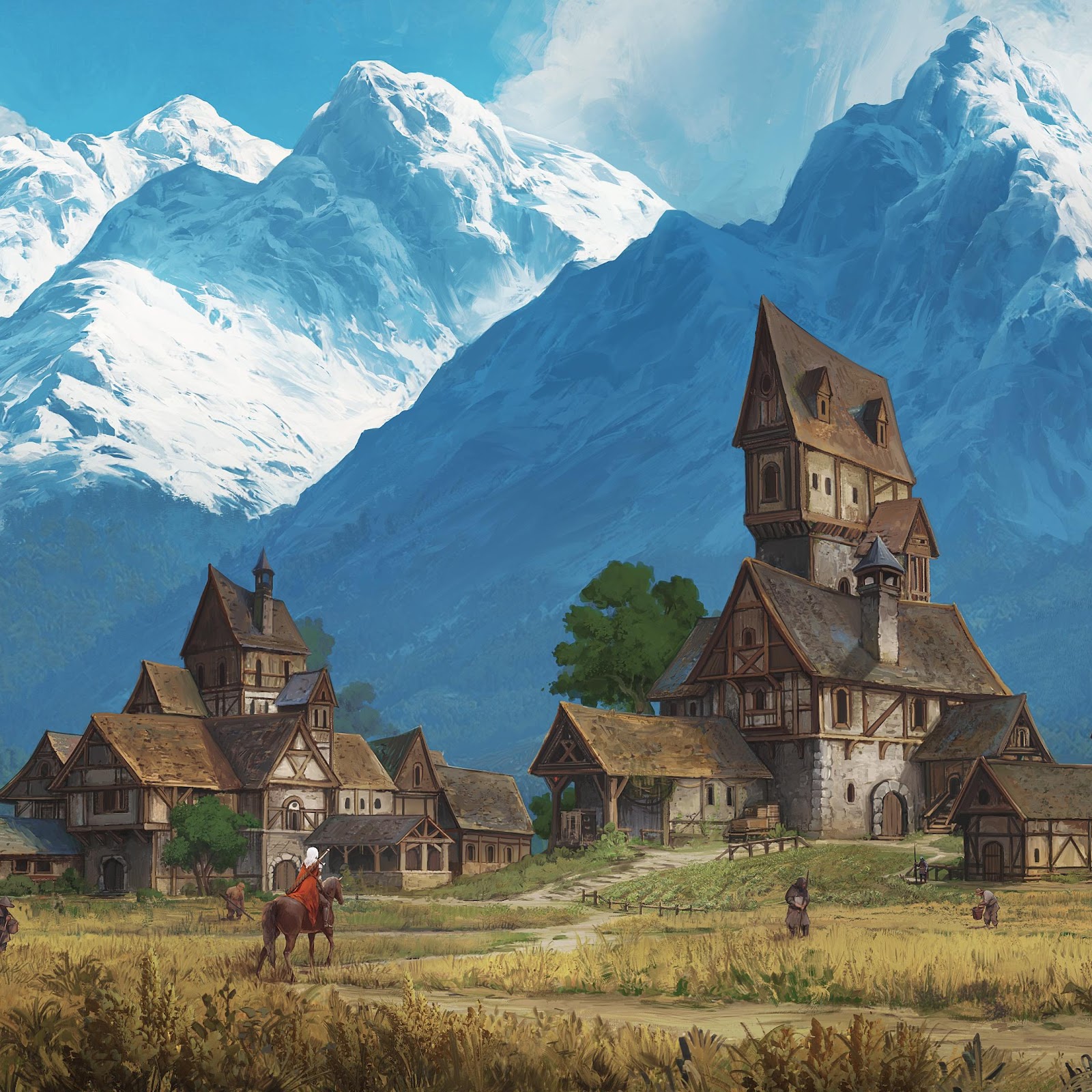 A fantasy village of stone and timber houses sits in a dry grassy field before gigantic snow-capped mountains, showing a picturesque conceptual art scene.