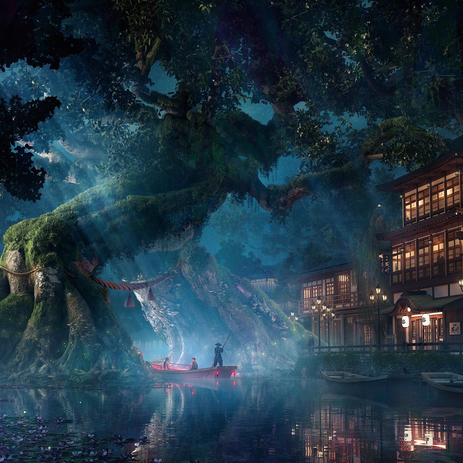 A massive, moss-covered tree arches over a dark pond next to traditional Japanese architecture illuminated by warm lights.