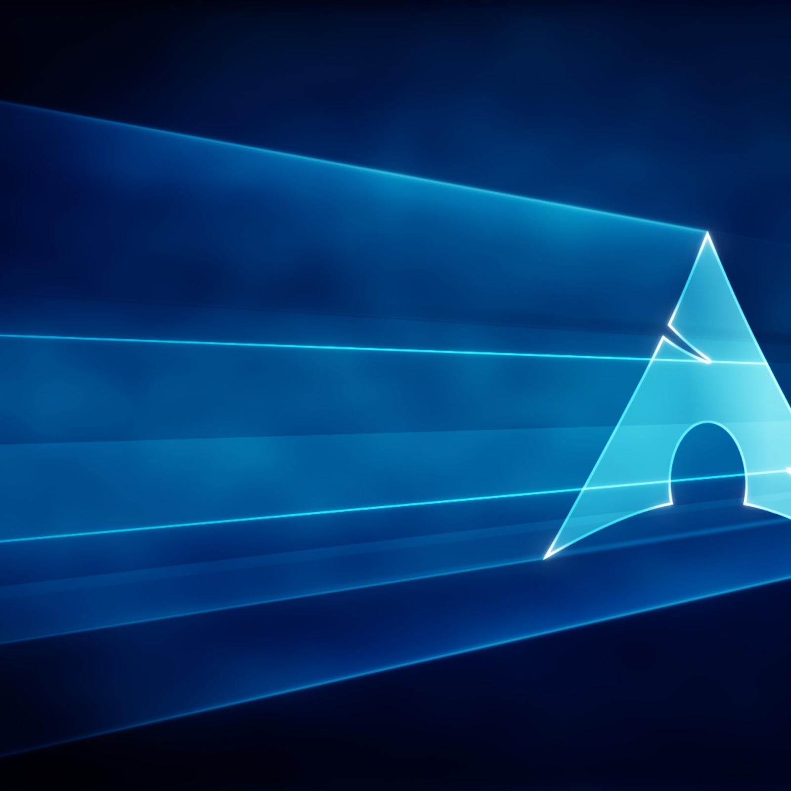 The Arch Linux logo shines brightly in neon blue, centered on a deep blue background showing diagonal streaks of light.