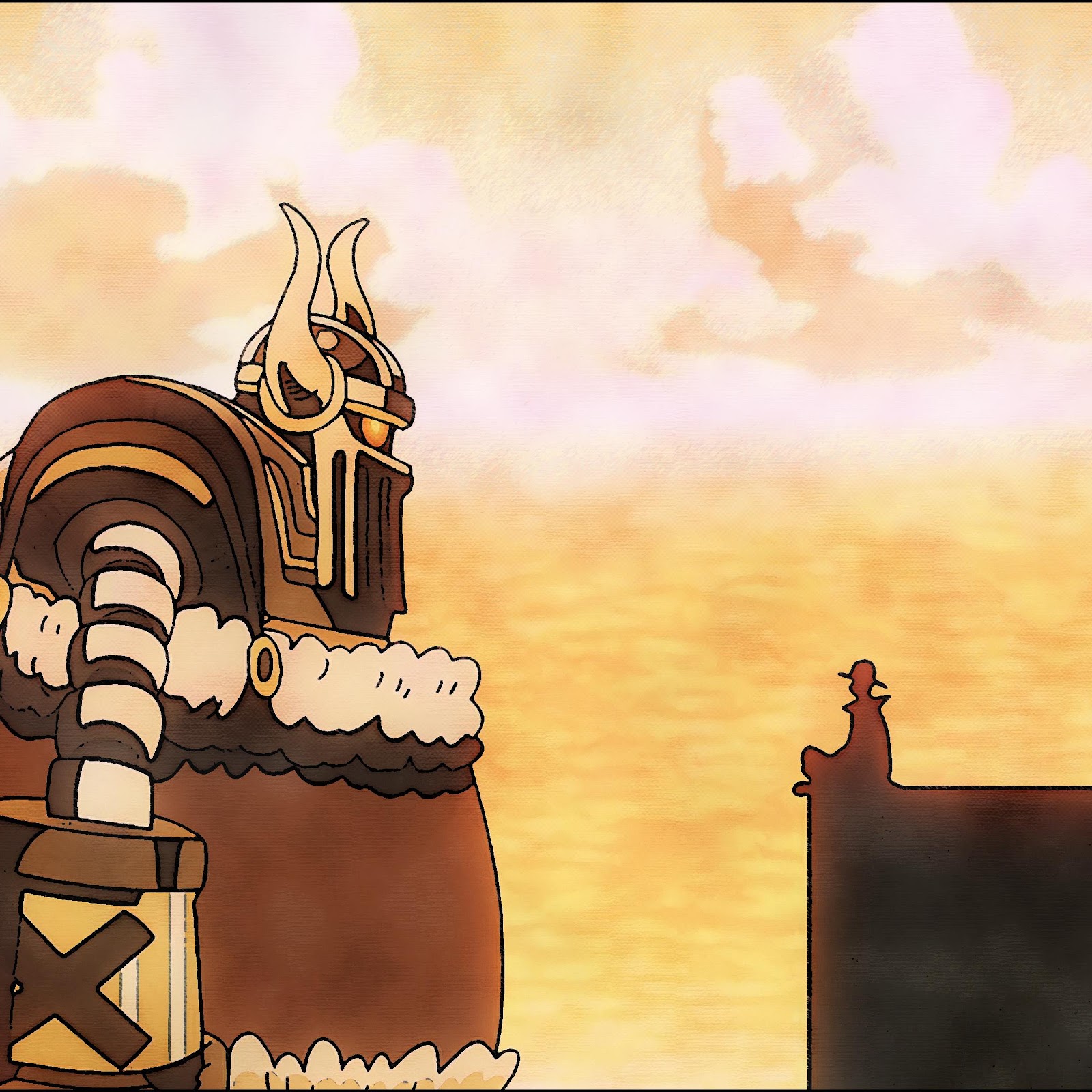 A large armored cartoon warrior with a cannon stands facing a tiny silhouetted figure under a glowing orange sky.