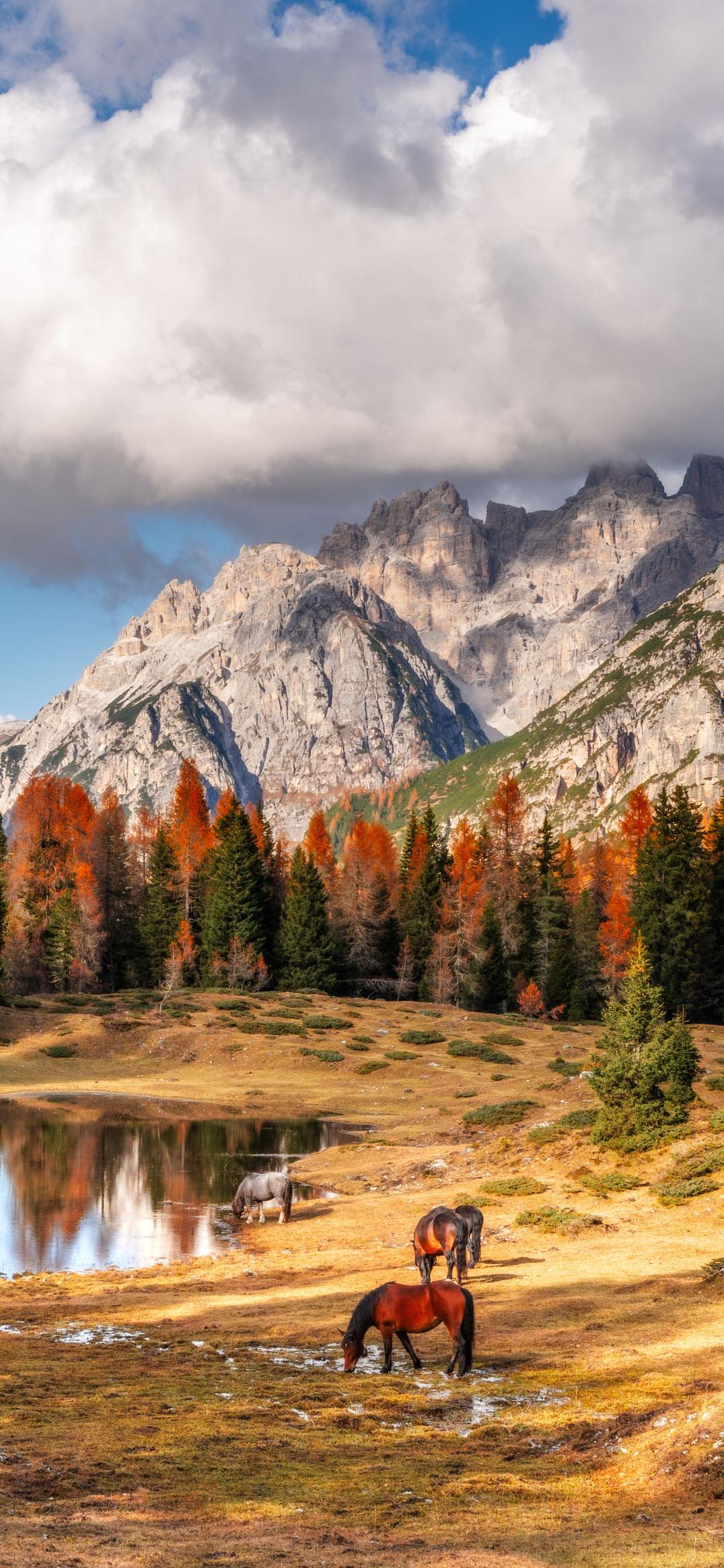 Autumn Horses Near Alpine Peaks iPhone Wallpaper Three horses graze in a golden autumn meadow next to a pond, framed by imposing gray mountains. la532 444.76 KB 1076x2331 Download original File Size: Dimensions: Format: Mobile ID: Alpine Landscape Autumn Colors Brown Dolomites Grazing Horses Nature Photo Wilderness