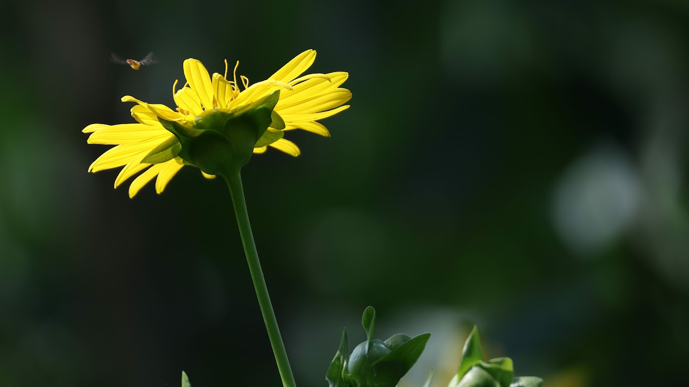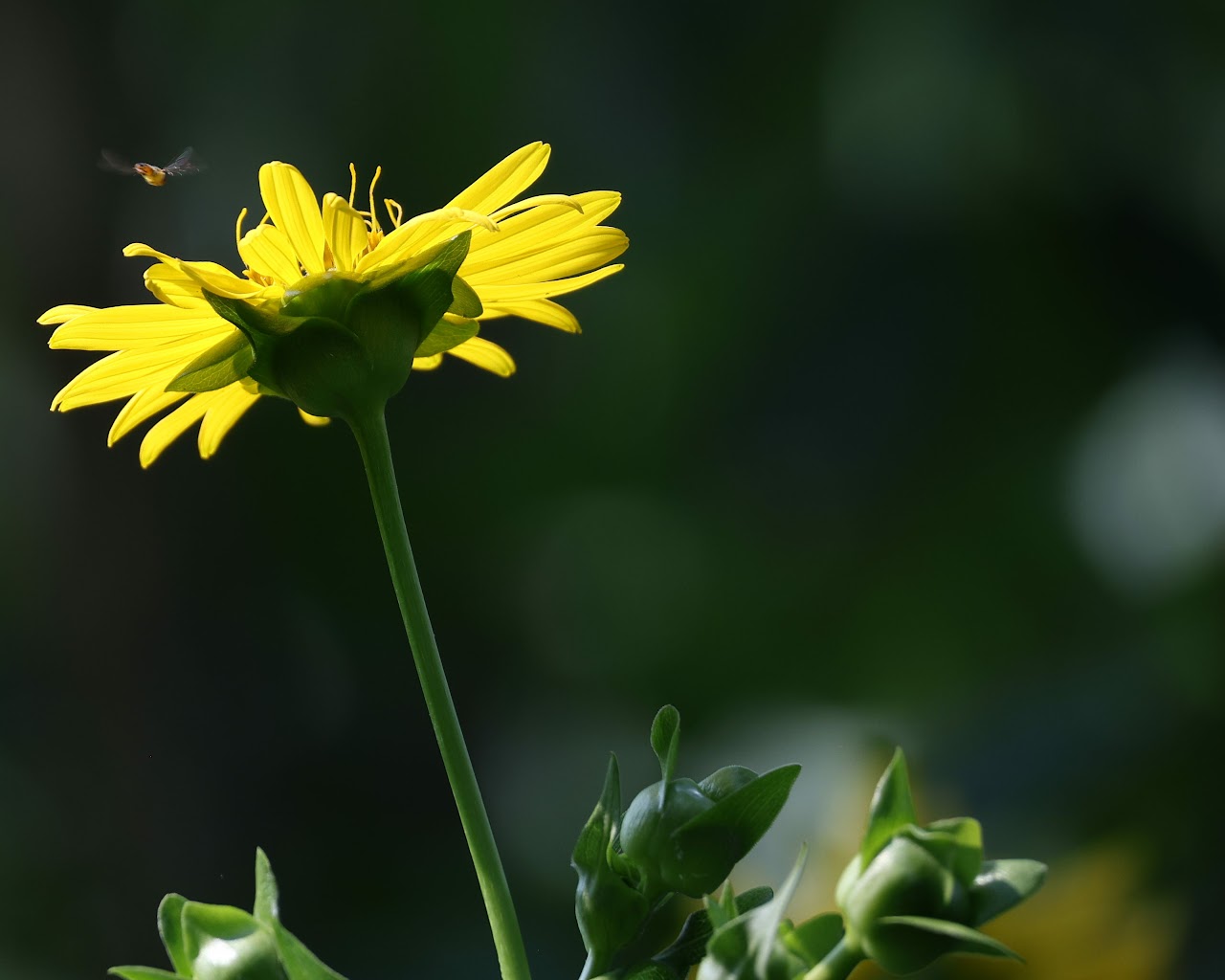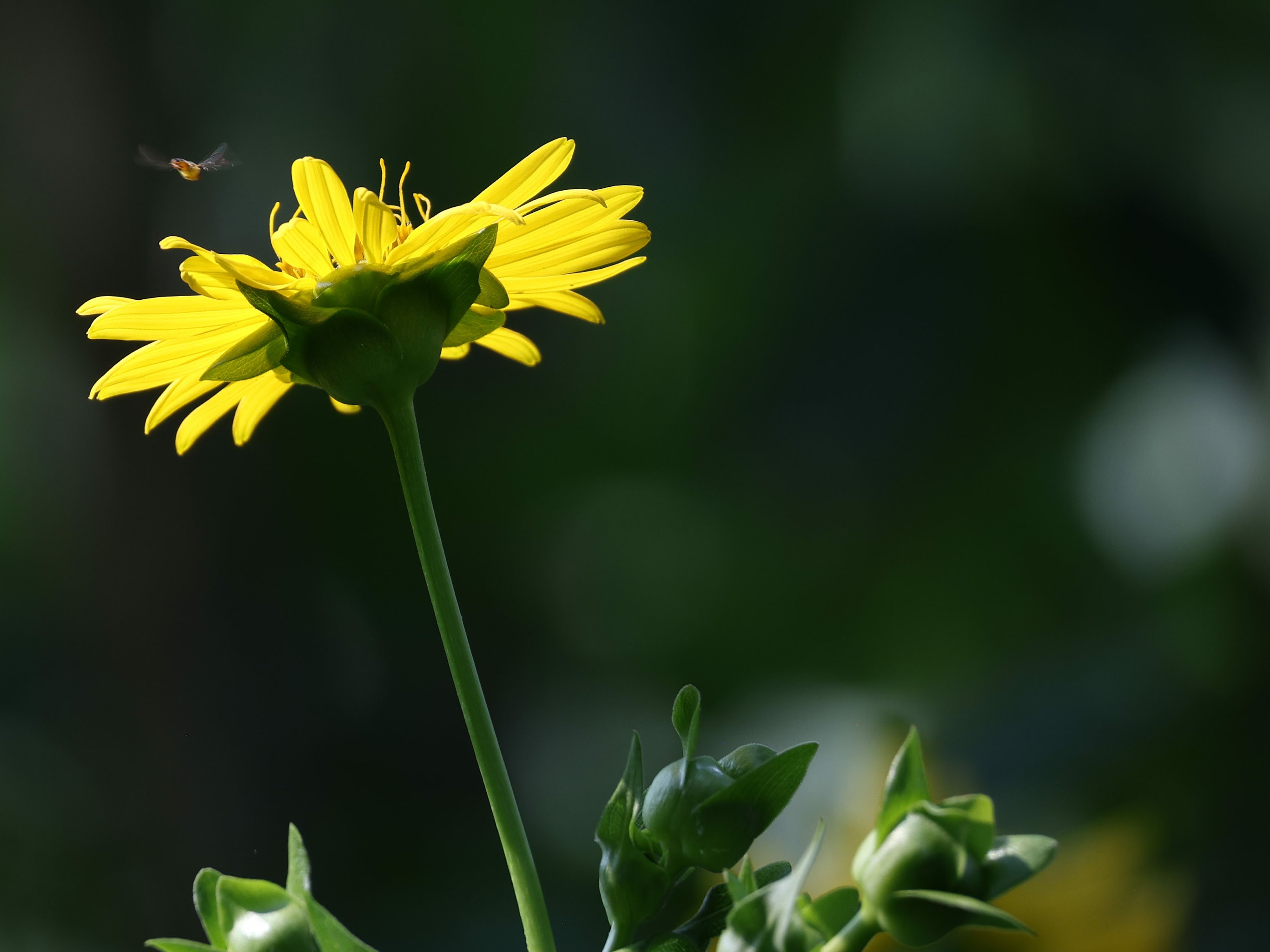 A bright yellow flower is backlit by sunlight against a deep dark background with a tiny insect flying near the petals.