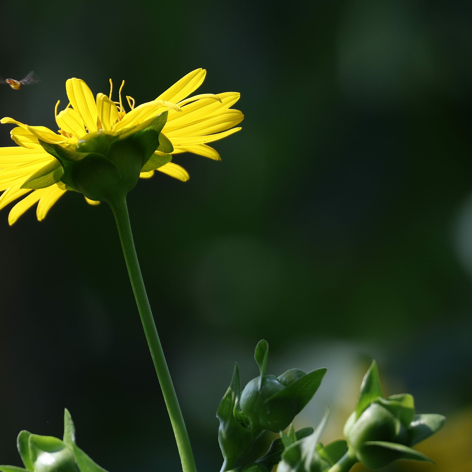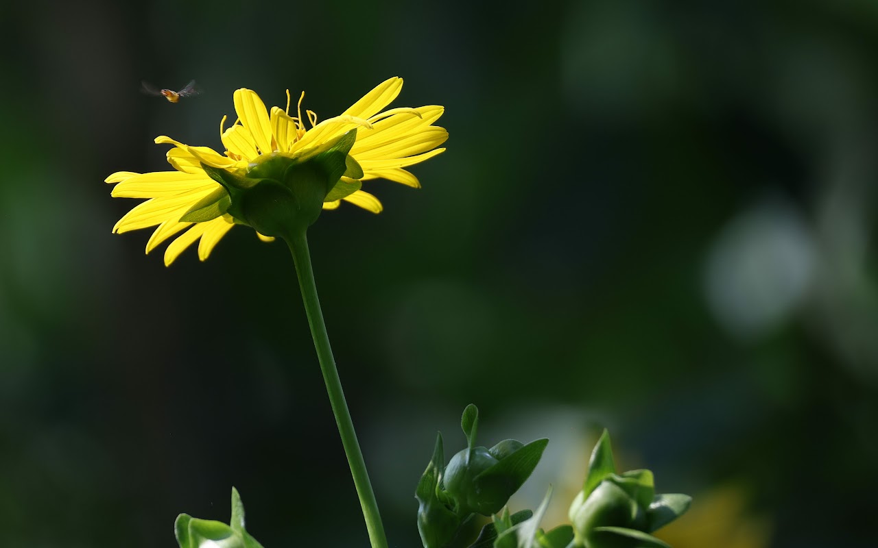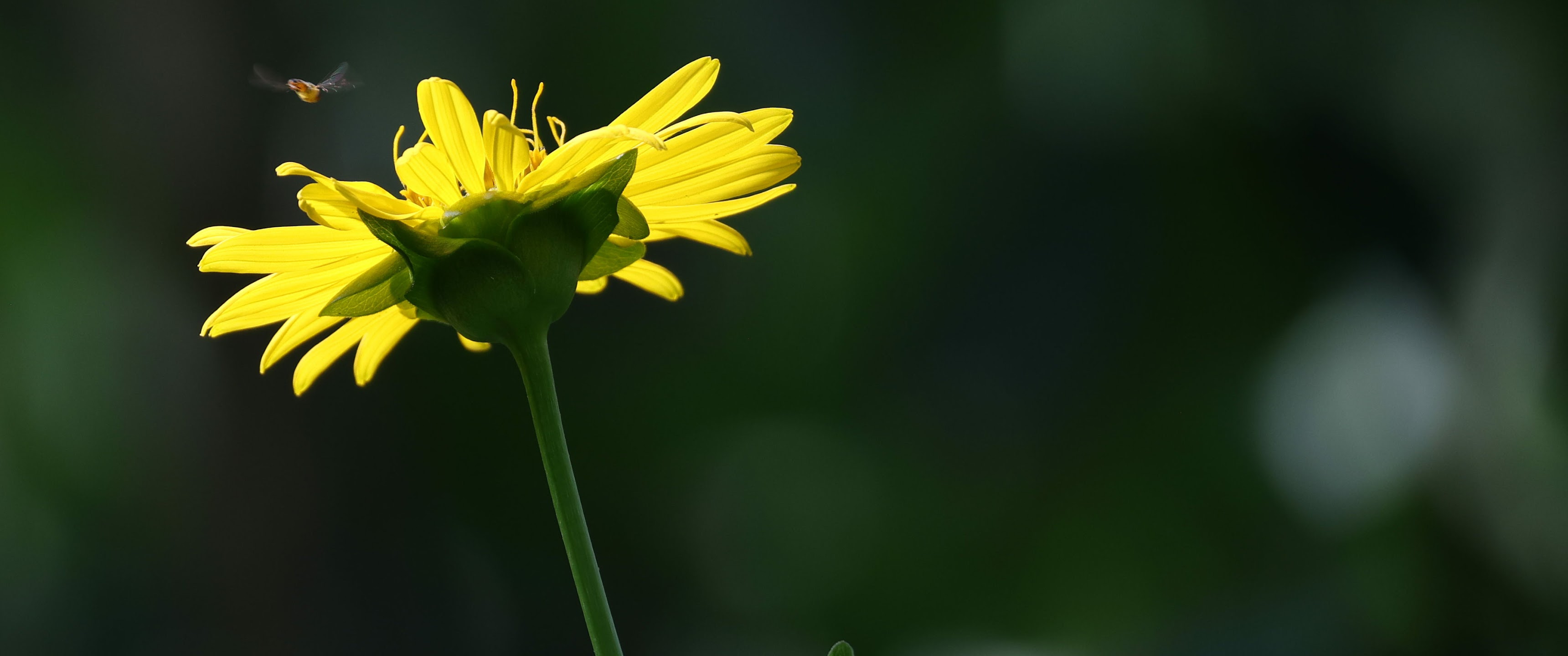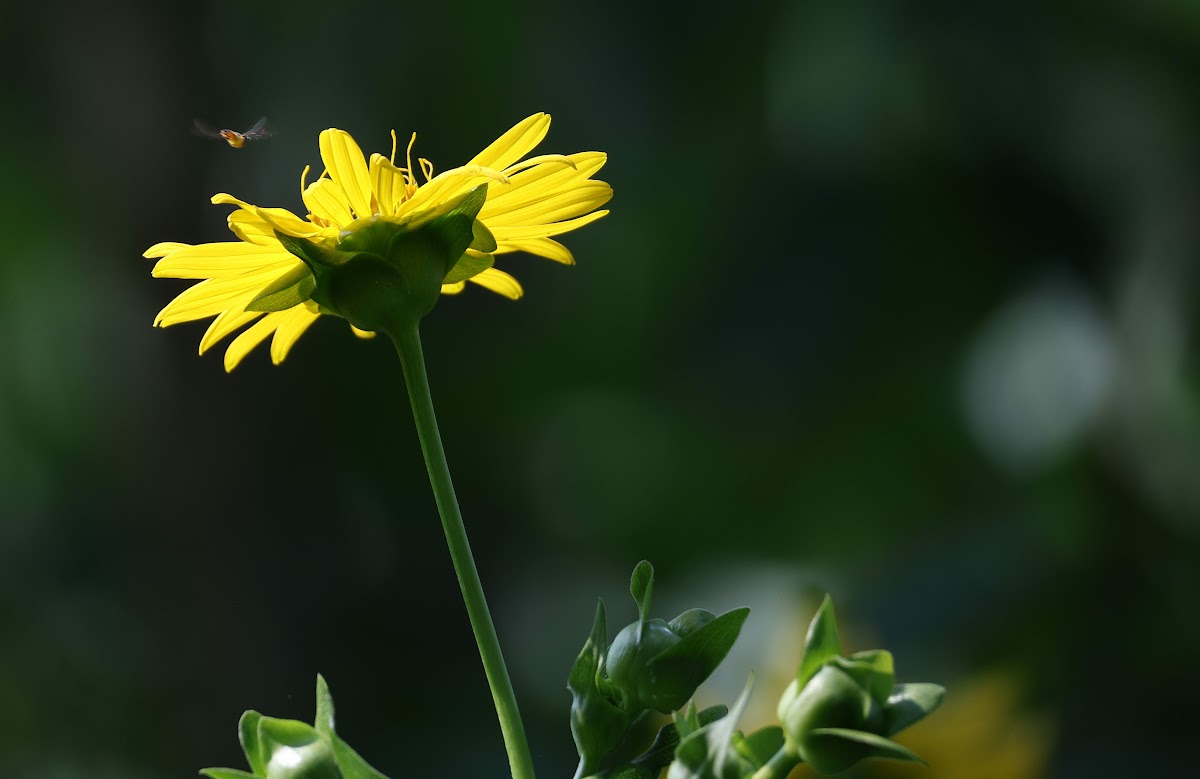 A bright yellow flower is backlit by sunlight against a deep dark background with a tiny insect flying near the petals.