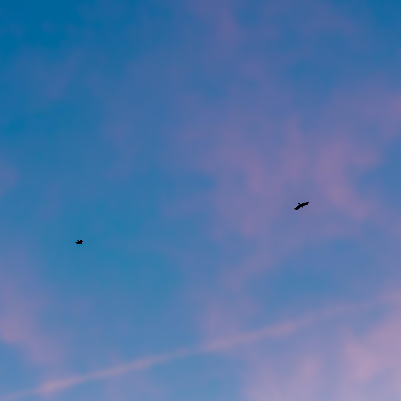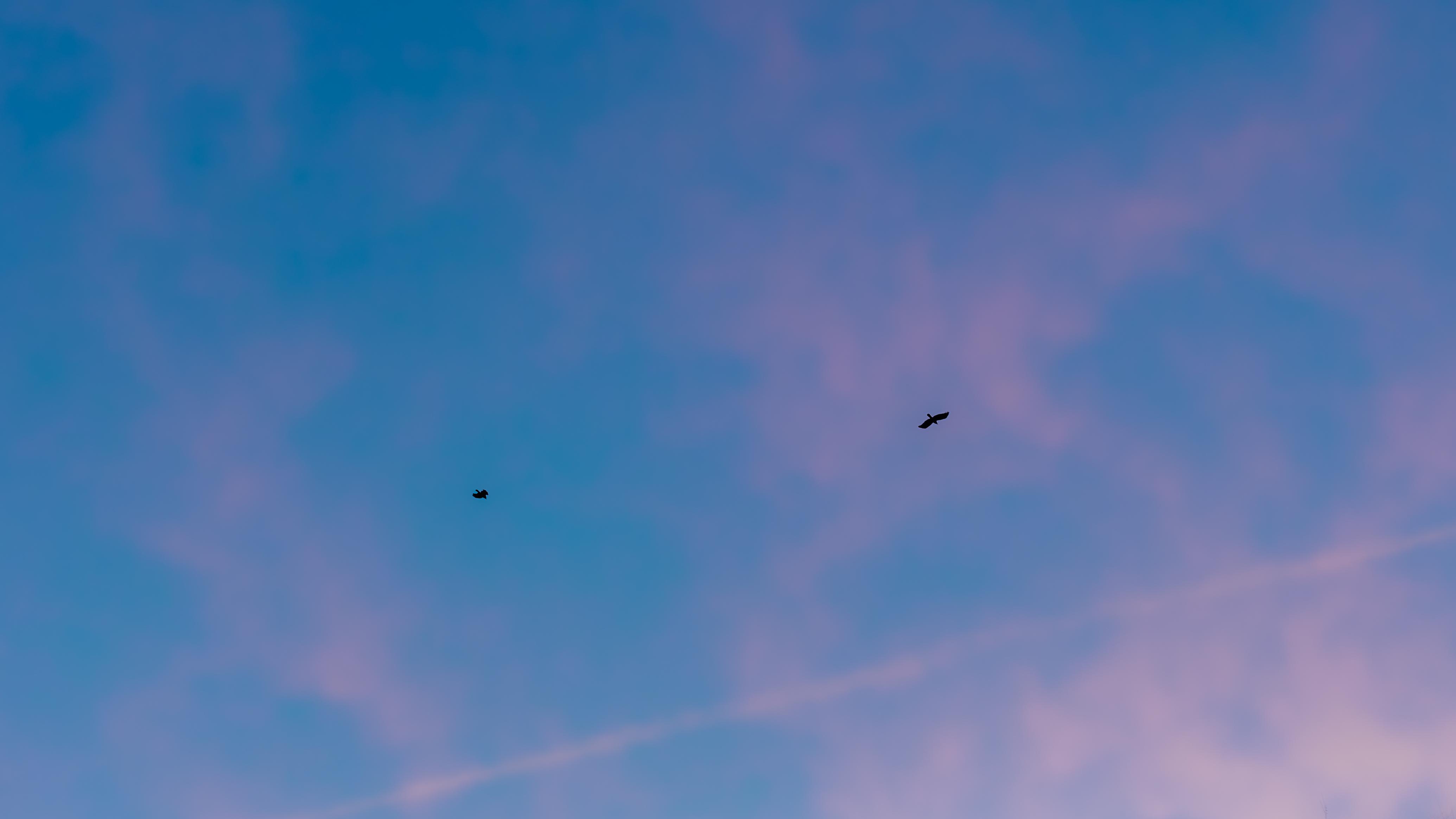 Two small bird silhouettes are flying high against a soft, colorful twilight sky showing pastel blue and purple tones.