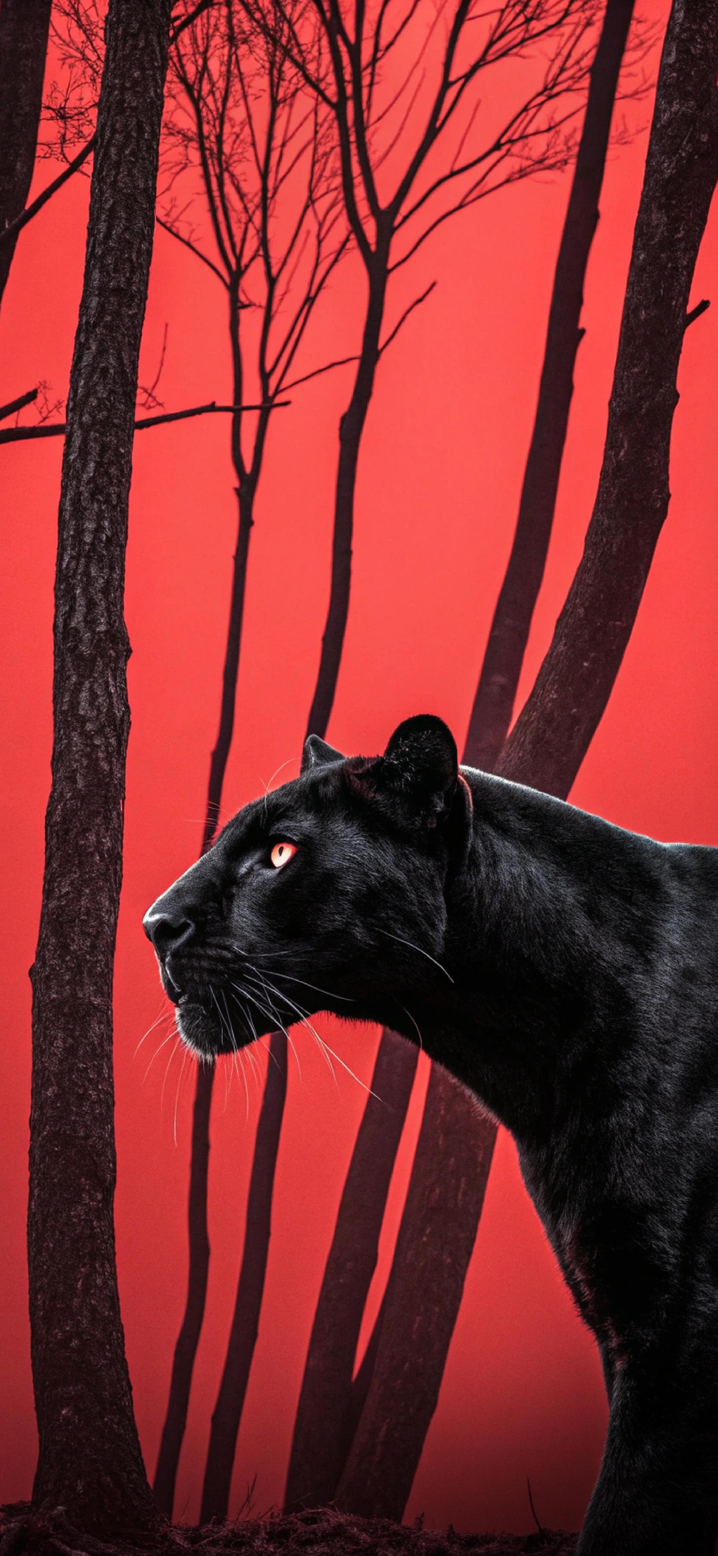 Black Panther In Red Forest - Stylized Wildlife Portrait 4K iPhone Wallpaper (2374x5144)