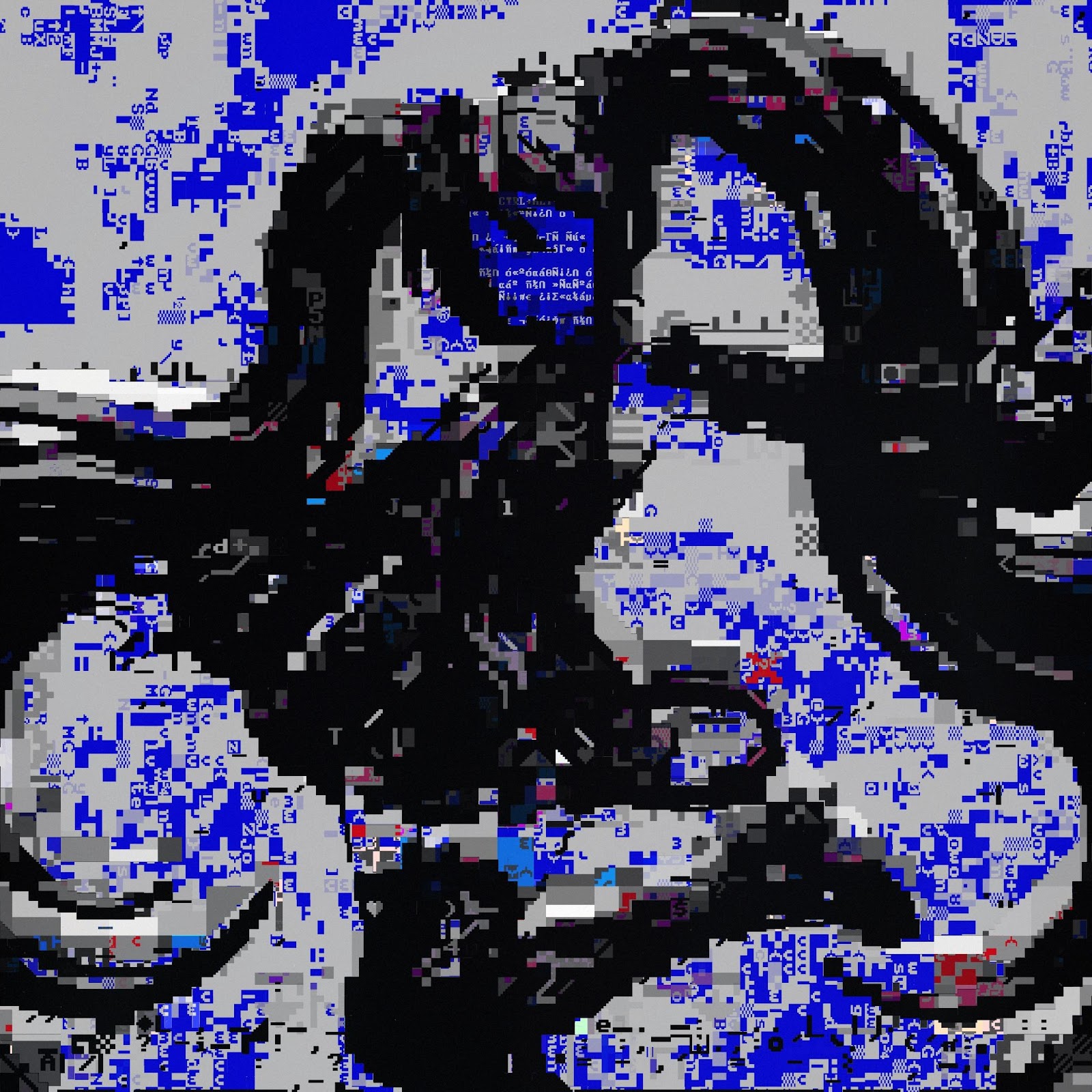 Abstract black swirling shapes are distorted across a bright gray background filled with intense blue glitch data blocks.