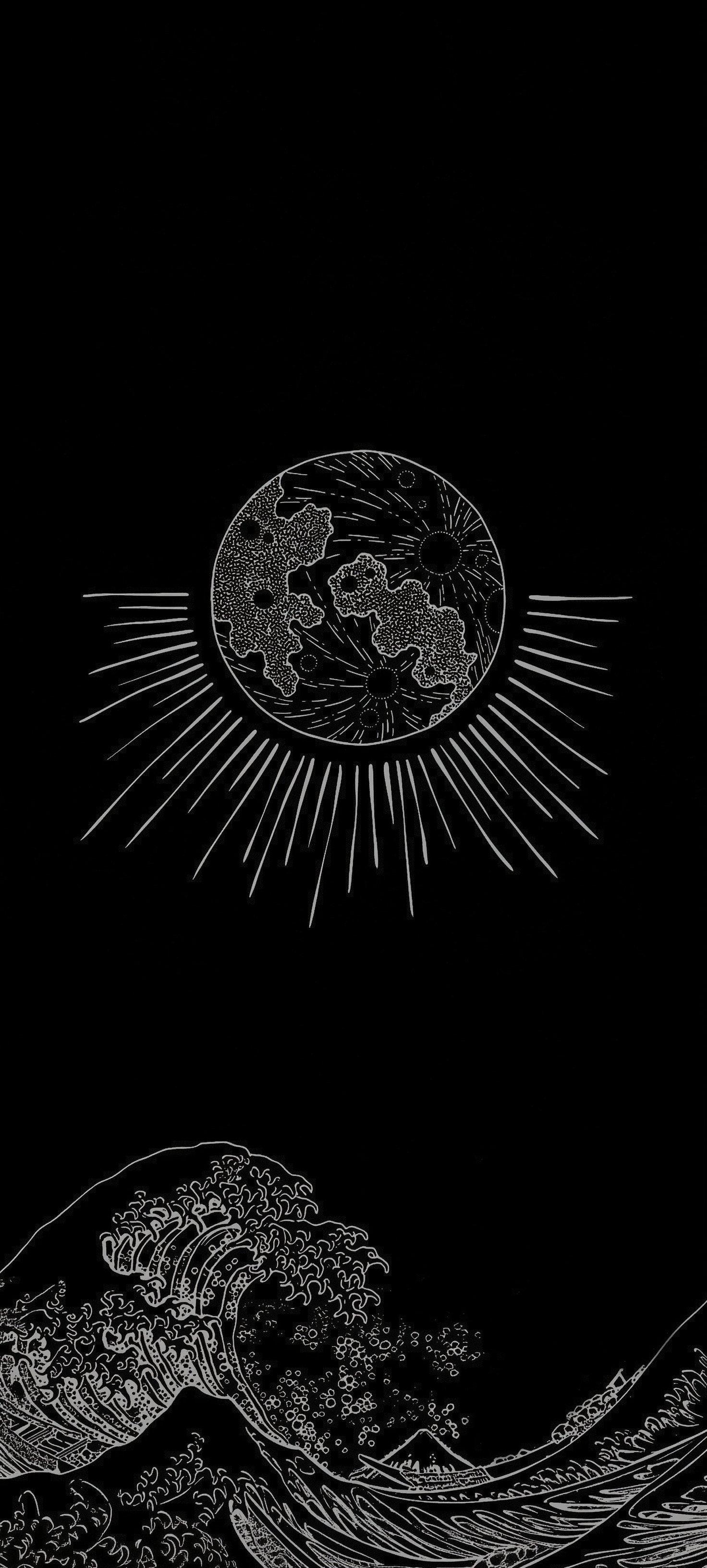 A stylized celestial moon with radiating rays hangs above a churning ocean wave in a stark black and white minimal aesthetic.