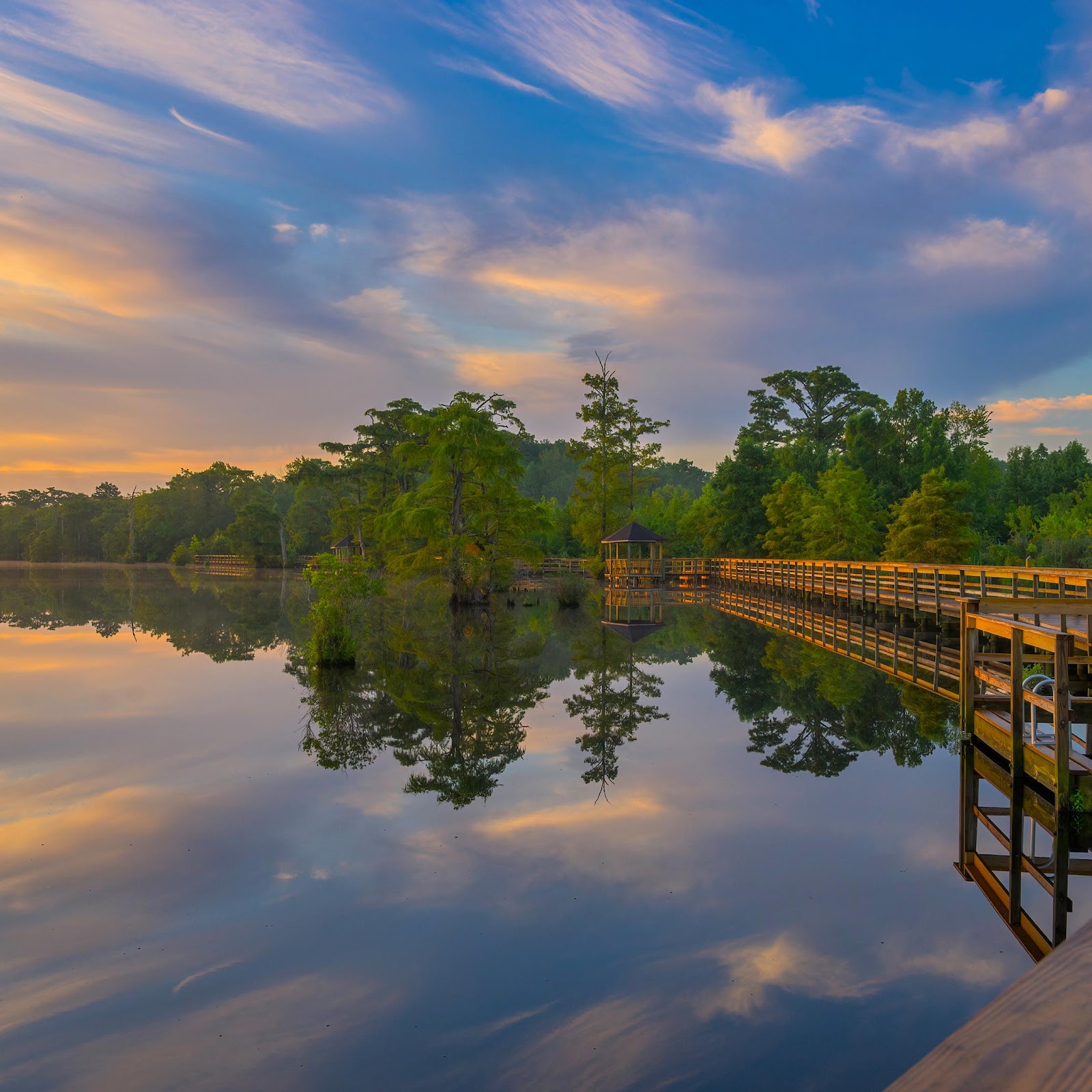 A wooden boardwalk and gazebo extends over calm water surrounded by green swamp trees, perfectly reflecting a stunning blue and orange sunrise.