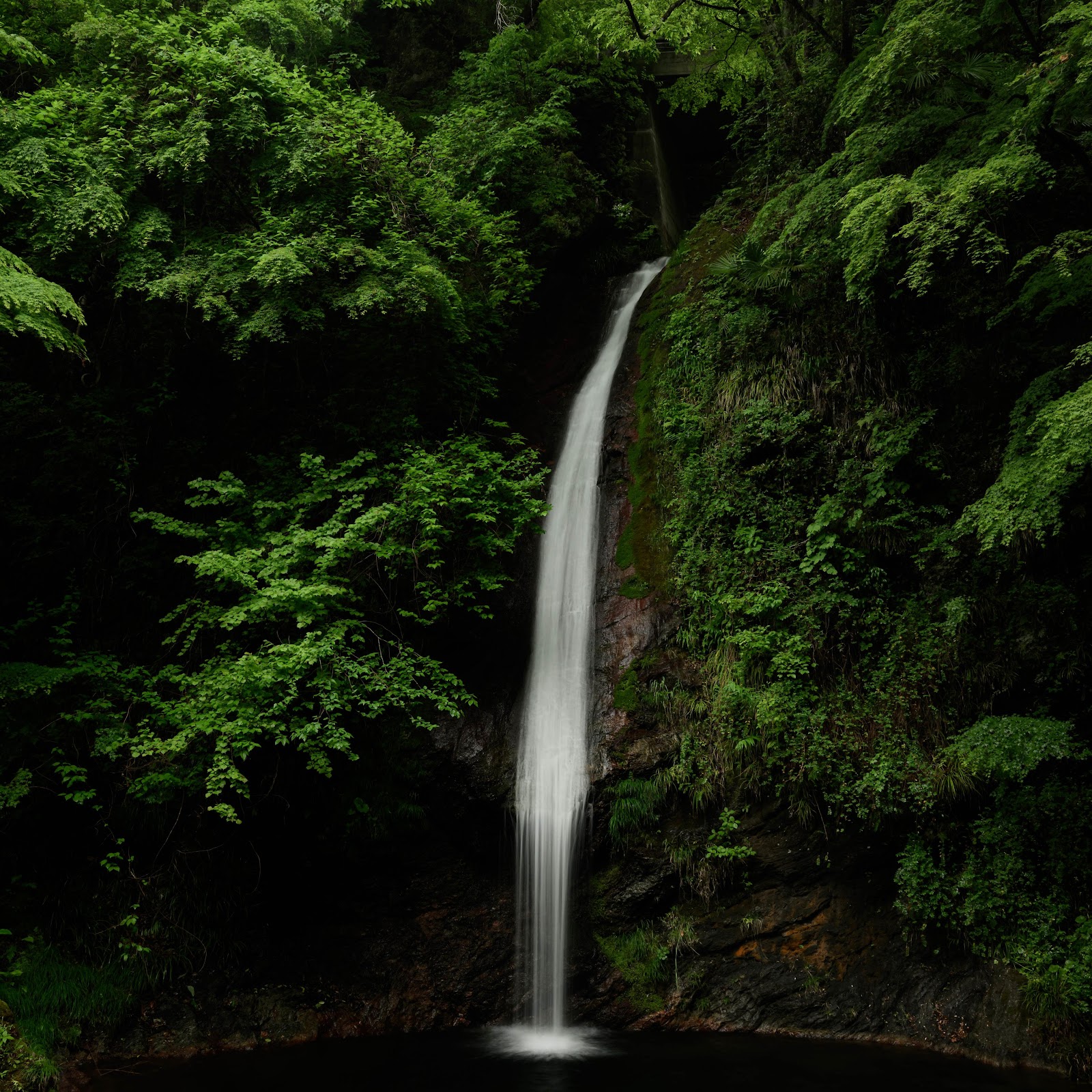 A narrow waterfall plunges down through dense dark green foliage into a still black pool, captured with a misty motion blur.