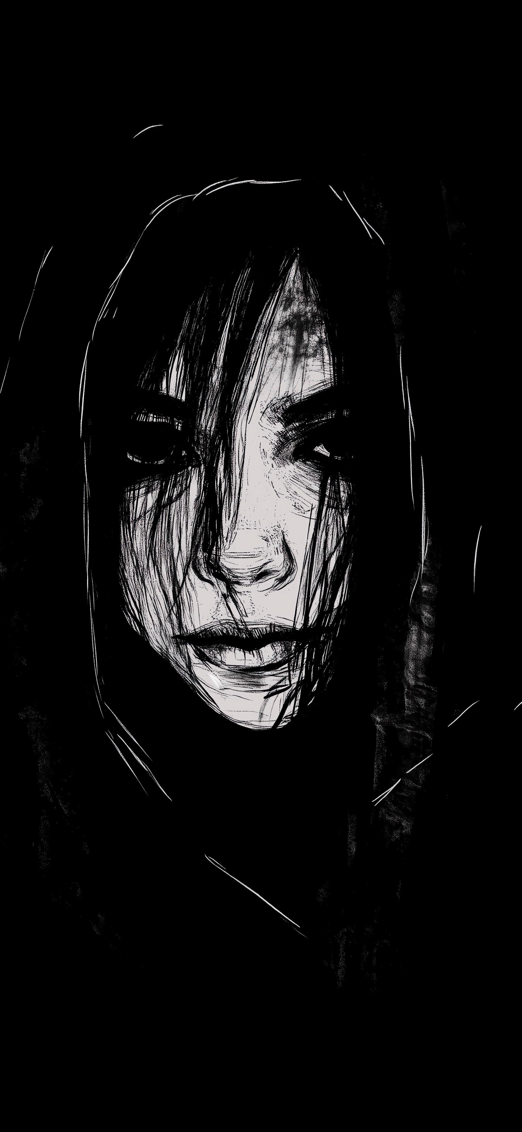 Dark Grunge Face Sketch 2K iPhone Wallpaper A haunted face portrait emerges from the darkness with messy dark hair covering the eyes in a high-contrast grunge sketch style. vk494 417.41 KB 1720x3728 Download original File Size: Dimensions: Resolution: 2K Format: Mobile ID: Black Black And White Dark Art Digital Sketch Grunge Portrait Haunted Spooky