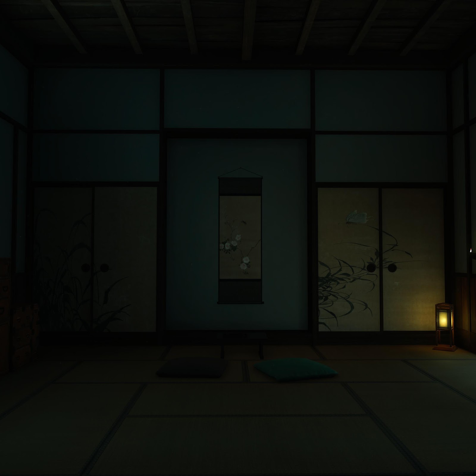 A dark traditional Japanese tatami room interior shows sliding screens and a glowing doorway leading to the peaceful outside garden.