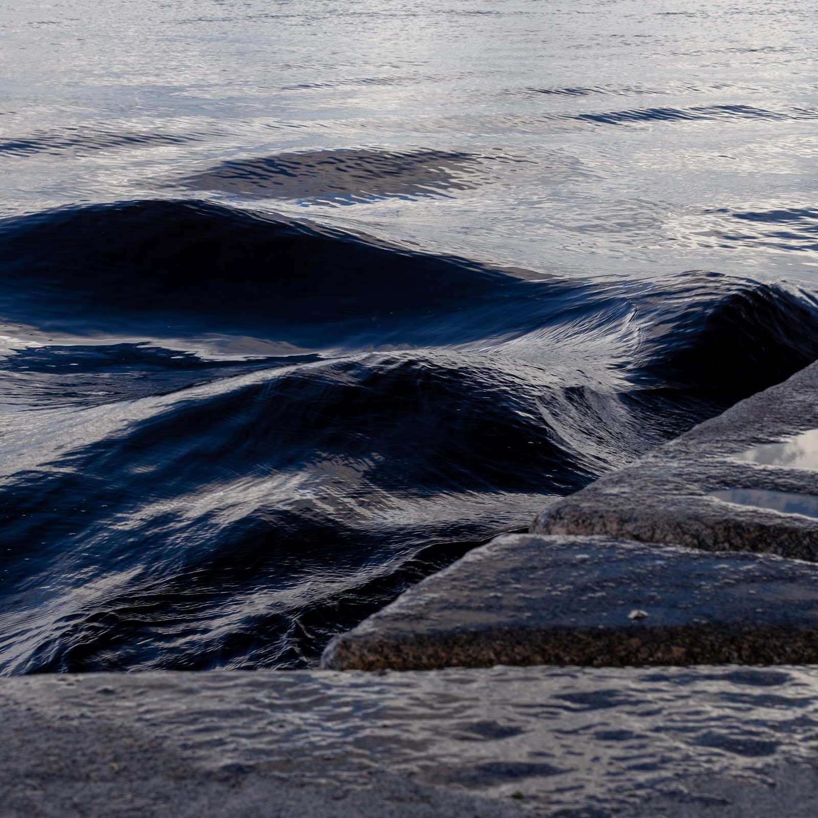 Deep blue water waves crash gently against a gray stone jetty in a moody close-up shot.