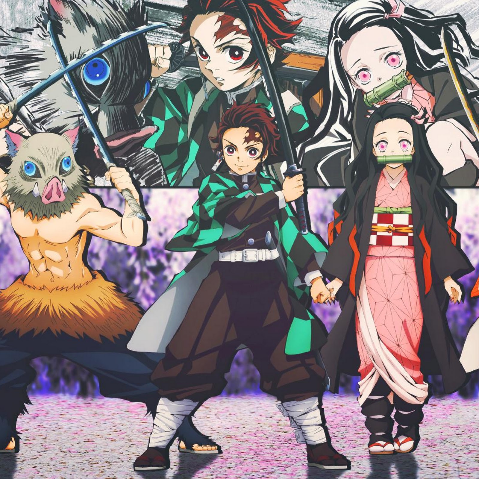 The main cast of Demon Slayer stands ready for battle in a dynamic collage blending anime character models and manga line art backgrounds.