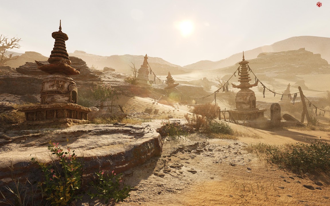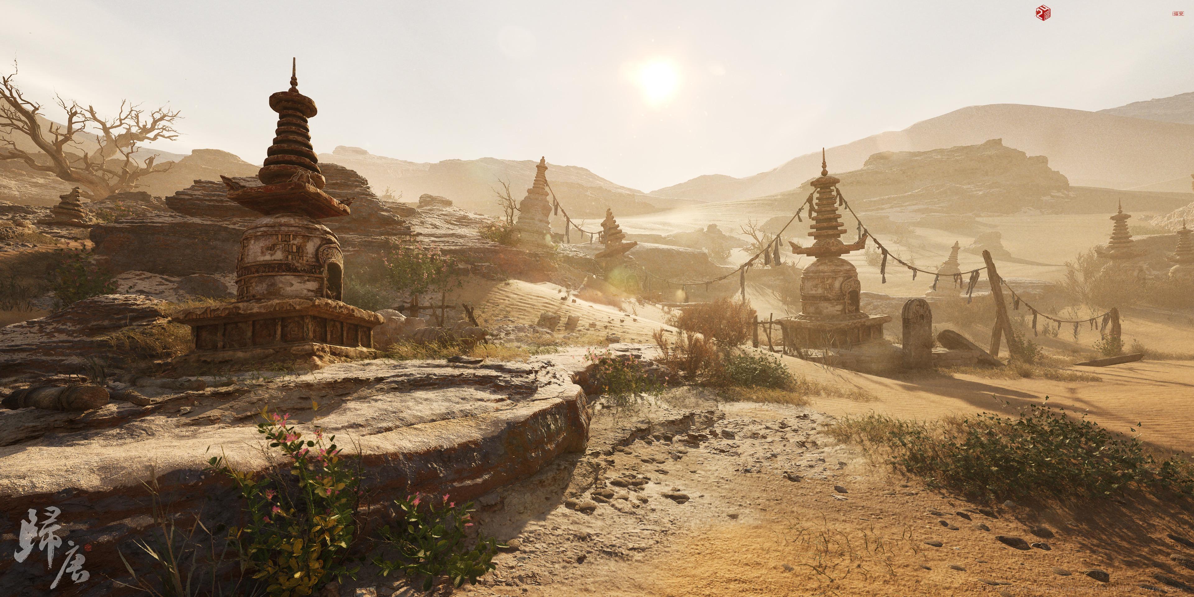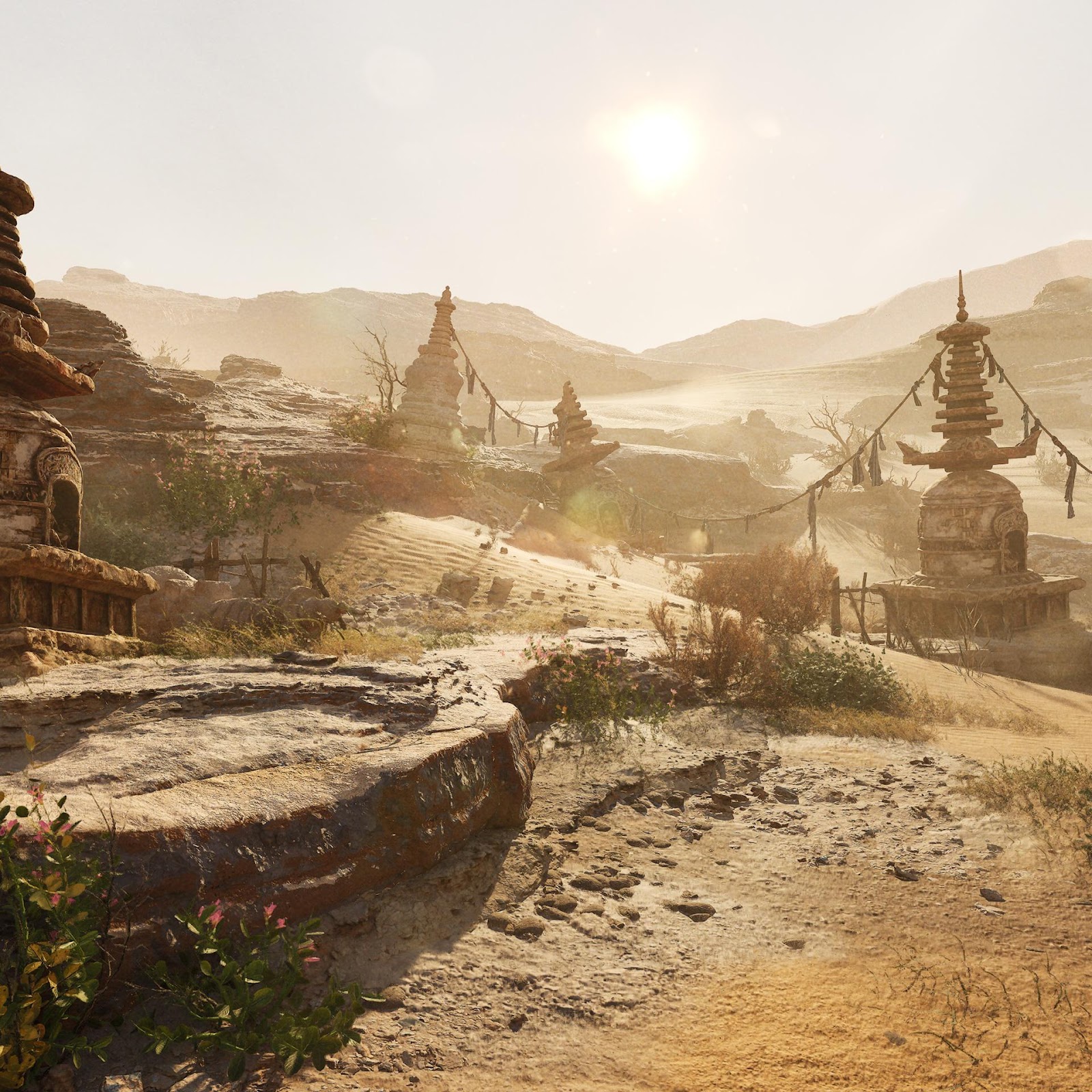 Ancient tiered stupas stand in a rugged desert environment under a bright hazy sun, conveying an arid, historical vibe.