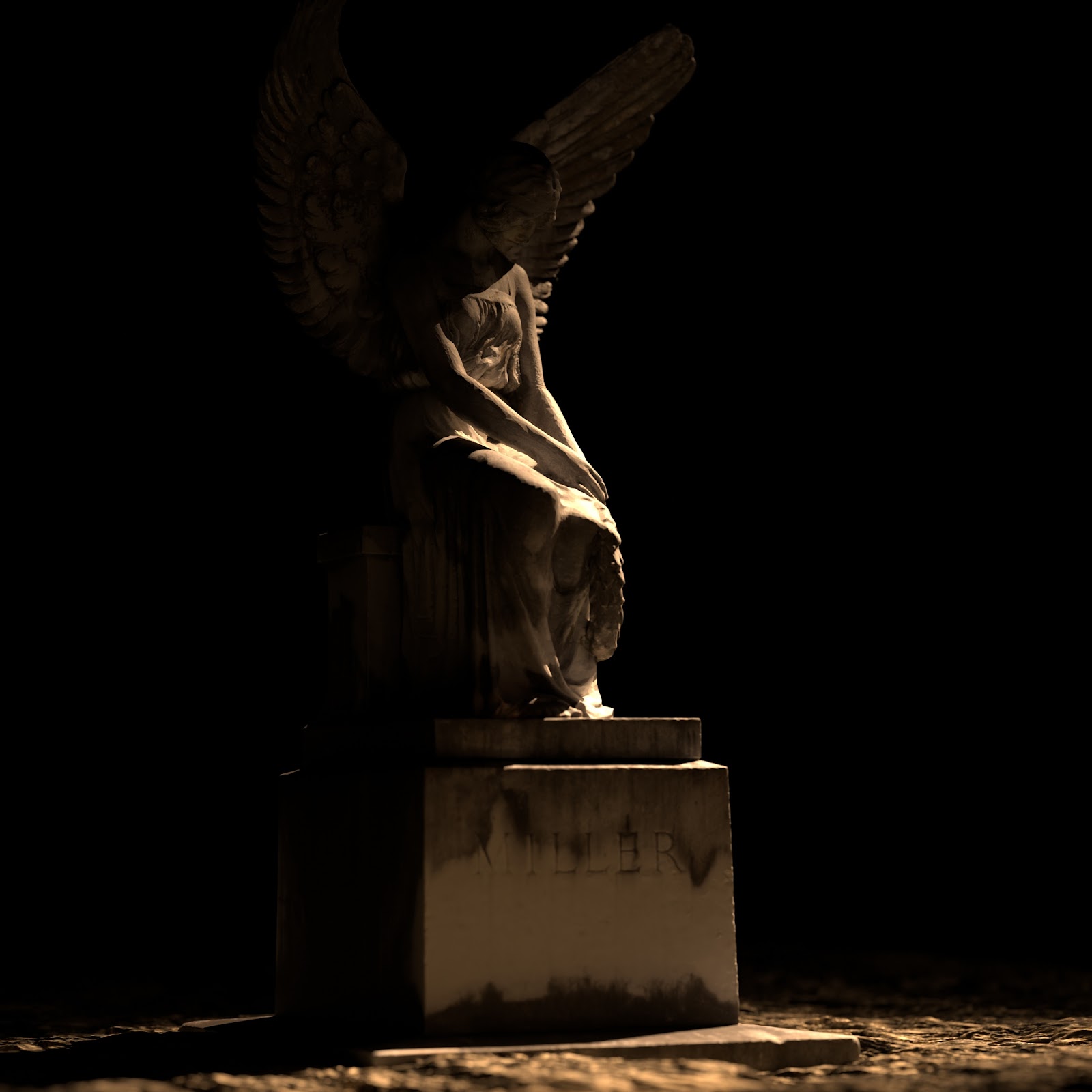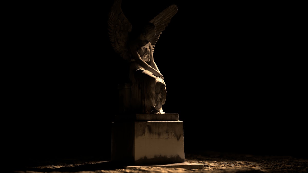 A grieving stone angel statue sits on a monument base, dramatically lit against a deep black background, creating a moody and isolated scene.
