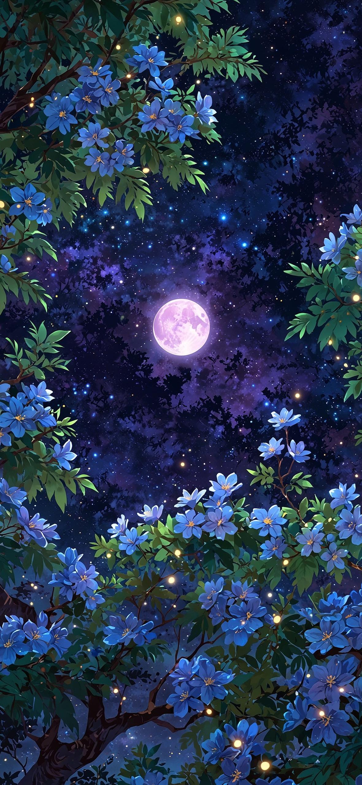 Enchanted Forest Under Purple Moon Full HD iPhone Wallpaper Blue flowers and dark green leaves frame a bright pink full moon under a magical, purple starry night sky. gv353 514.96 KB 1180x2556 Download original File Size: Dimensions: Resolution: Full HD Format: Mobile ID: Blue Blue Flowers Enchanted Forest Fantasy Art Full Moon Night Scene Starry Sky
