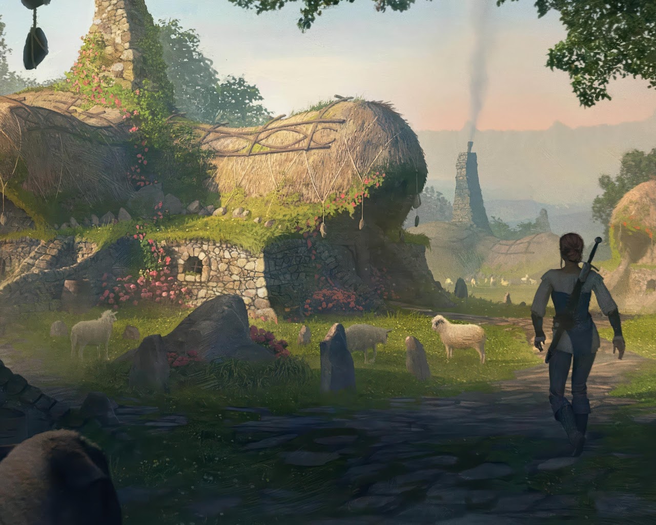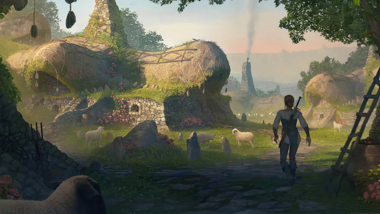 The Fable heroine walks through a green rural village with thatched roof cottages and grazing sheep in the morning sun.
