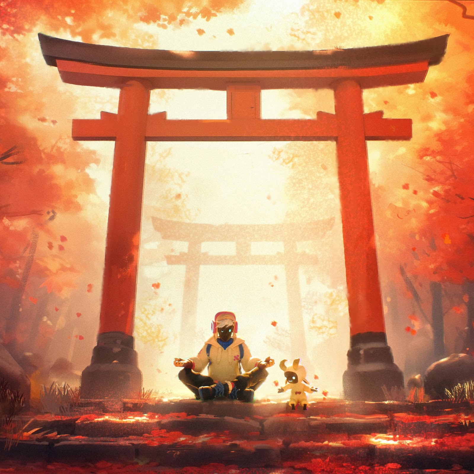 A person sits meditating with a small creature under a vibrant red Torii gate in an intensely colored autumn forest setting.