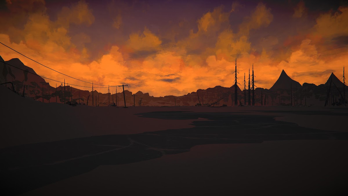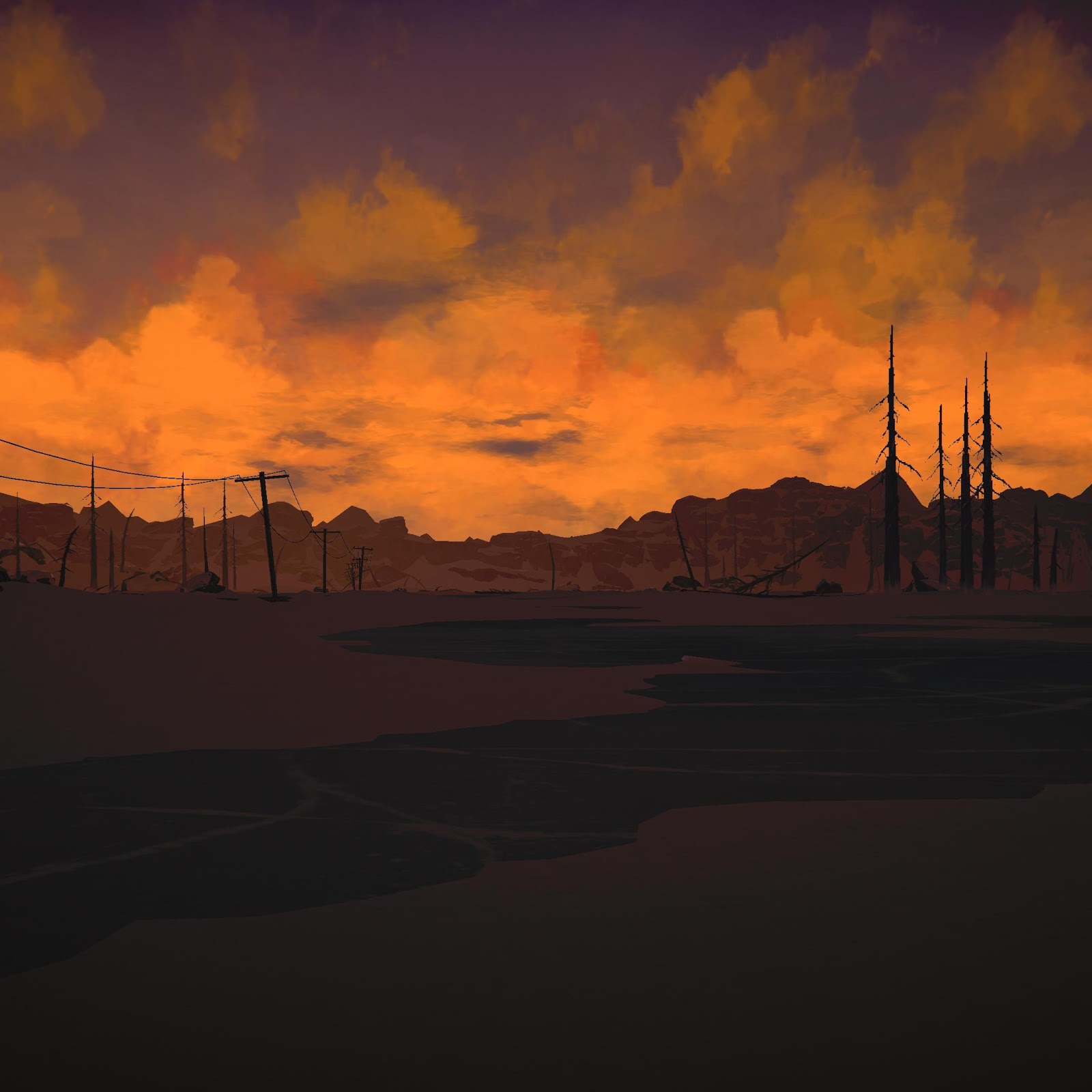A post-apocalyptic landscape shows dark silhouettes of mountains and power lines under a bright, fiery orange sky.