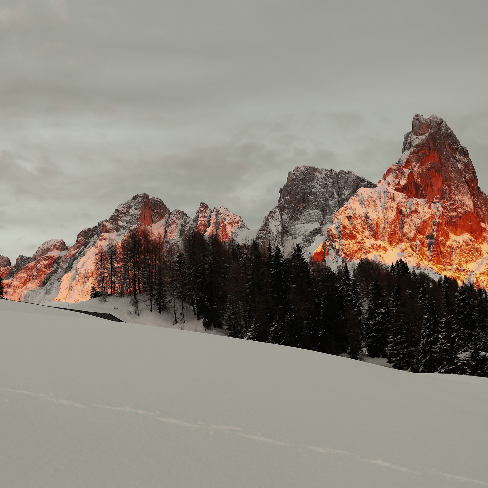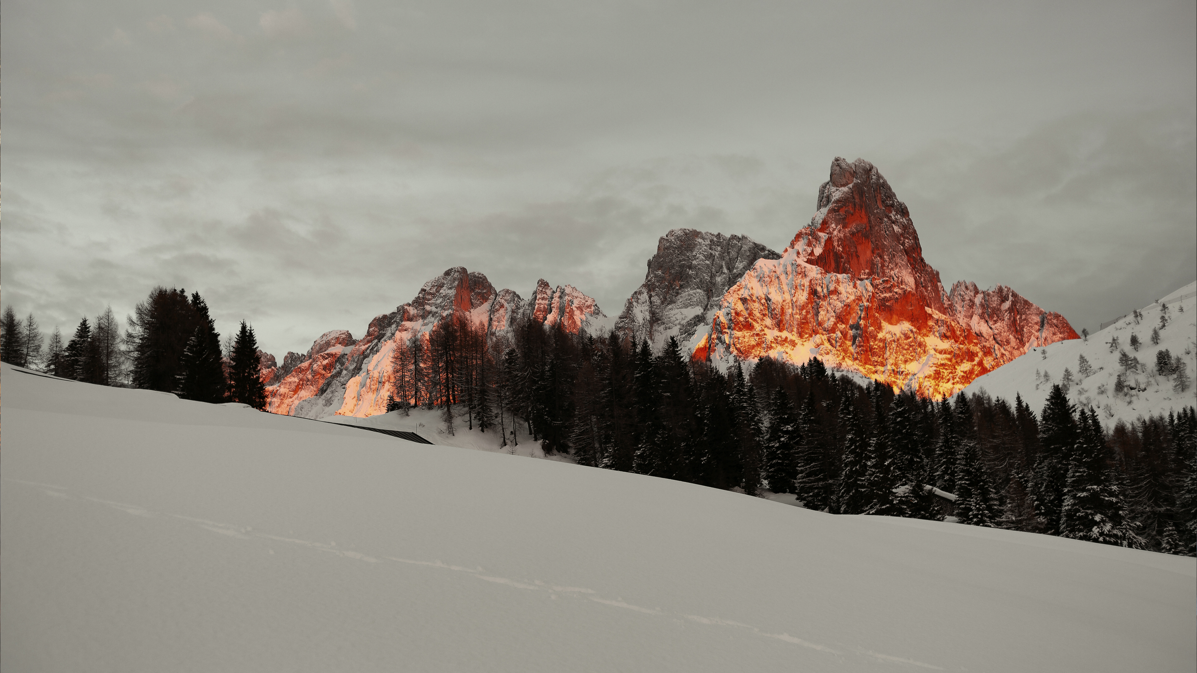 Fiery orange mountain peaks rise above a line of dark pine trees, contrasting with the gray sky and white foreground.