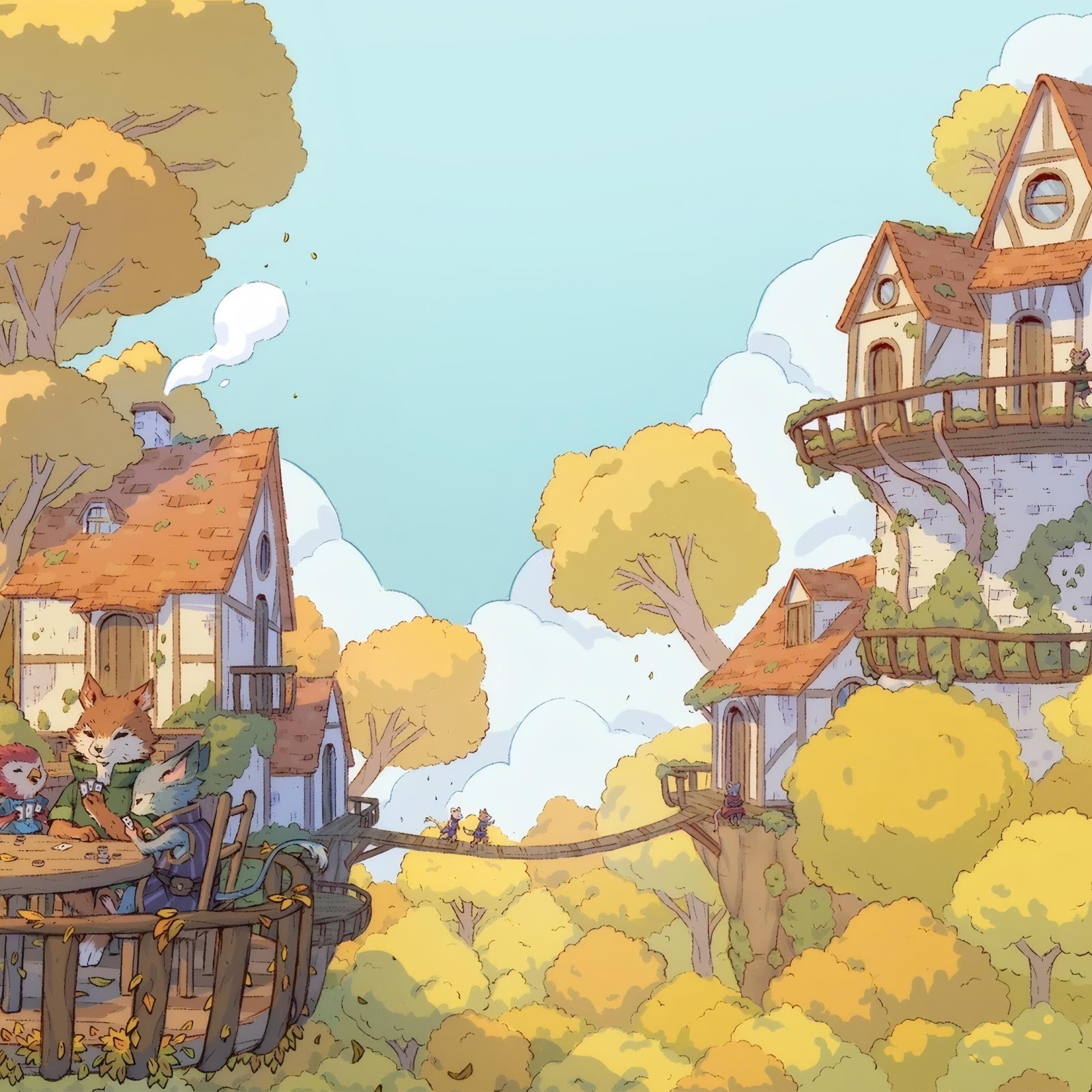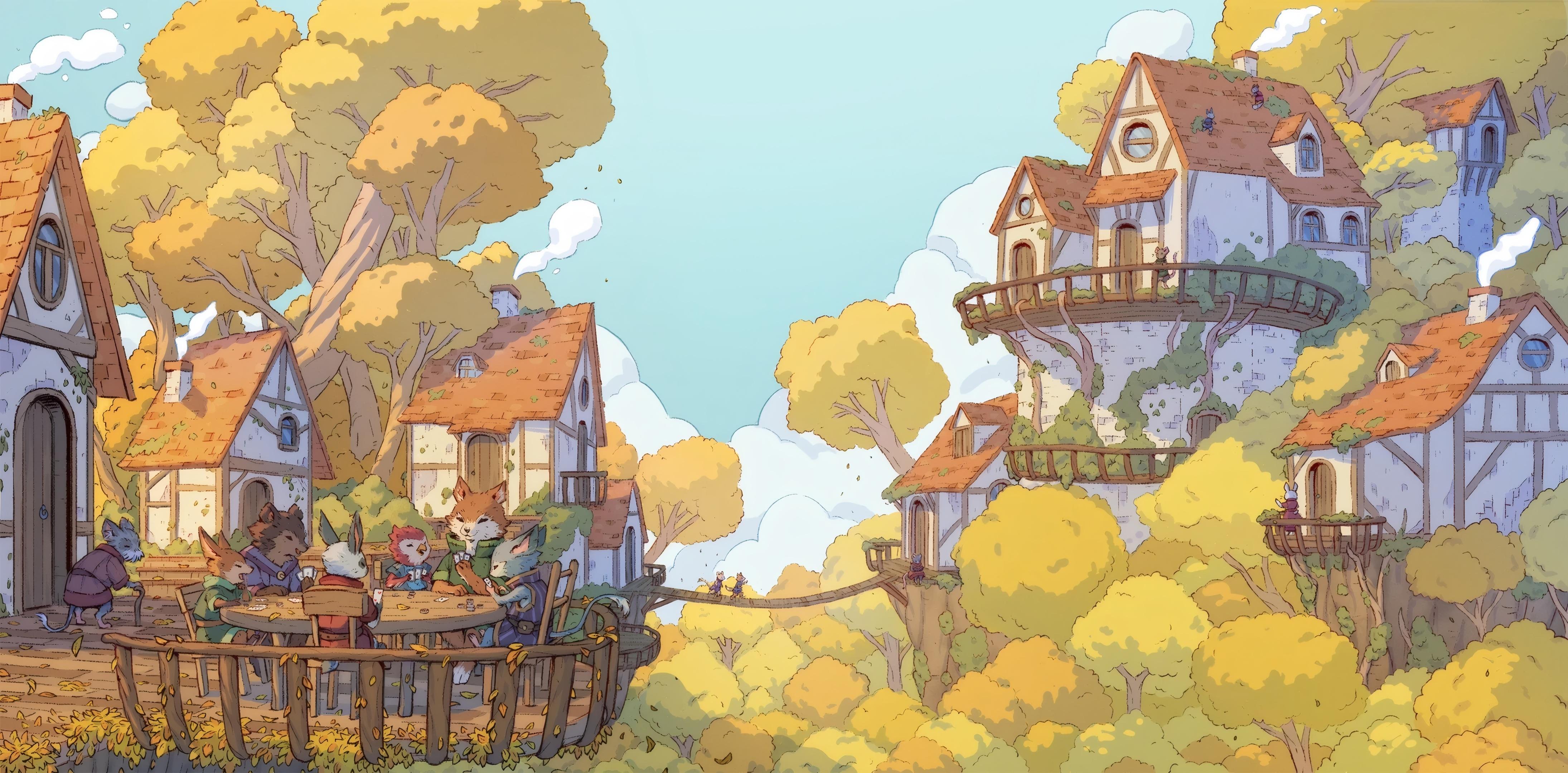 Anthropomorphic woodland creatures are playing a card game on a village balcony surrounded by bright golden autumn foliage.