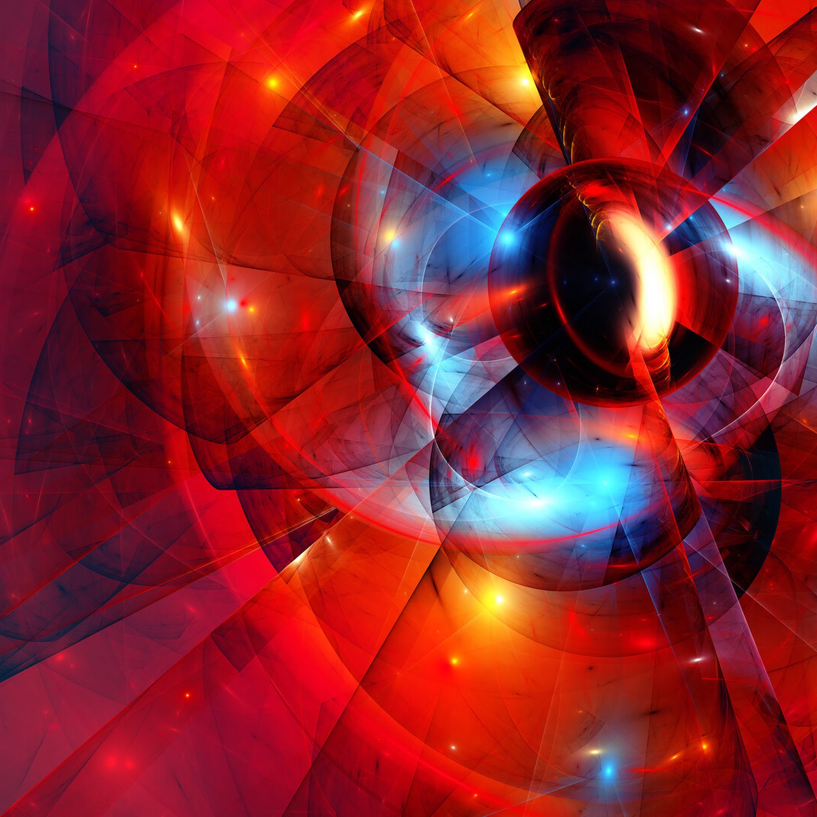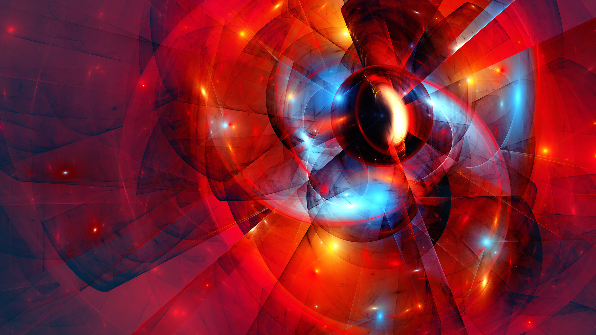 A complex abstract fractal shows dynamic circular layers with a central orb and glowing red and bright blue neon colors.