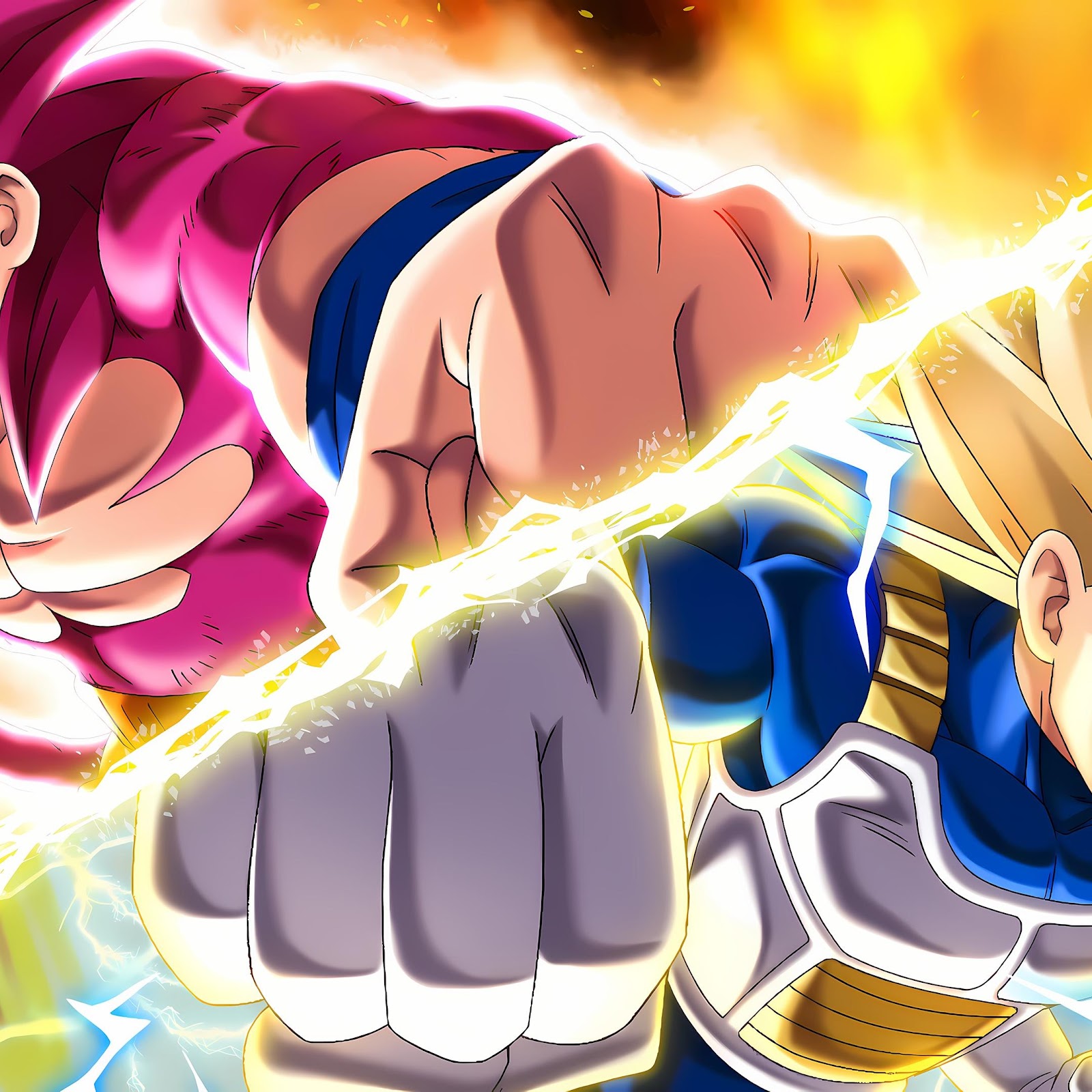 Goku in his SS4 form and Vegeta as a Super Saiyan clash fists, creating a bright yellow energy explosion in this vibrant anime scene.