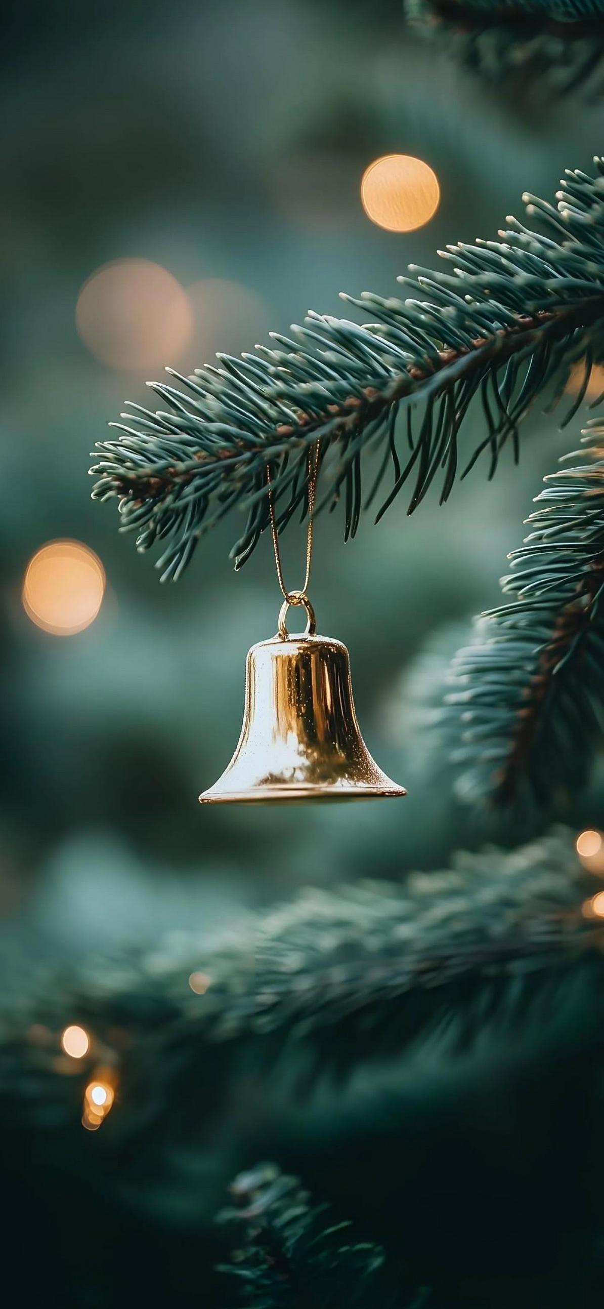 Golden Christmas Bell Ornament Full HD iPhone Wallpaper A shiny golden bell ornament hangs from a dark green pine branch with warm bokeh lights creating a cozy holiday mood. nm930 199.04 KB 1194x2586 Download original File Size: Dimensions: Resolution: Full HD Format: Mobile ID: Bokeh Lights Christmas Golden Bell Green Holiday Pine Branch Winter Vibe
