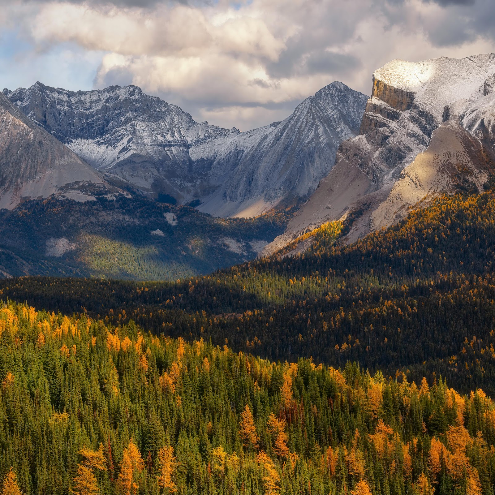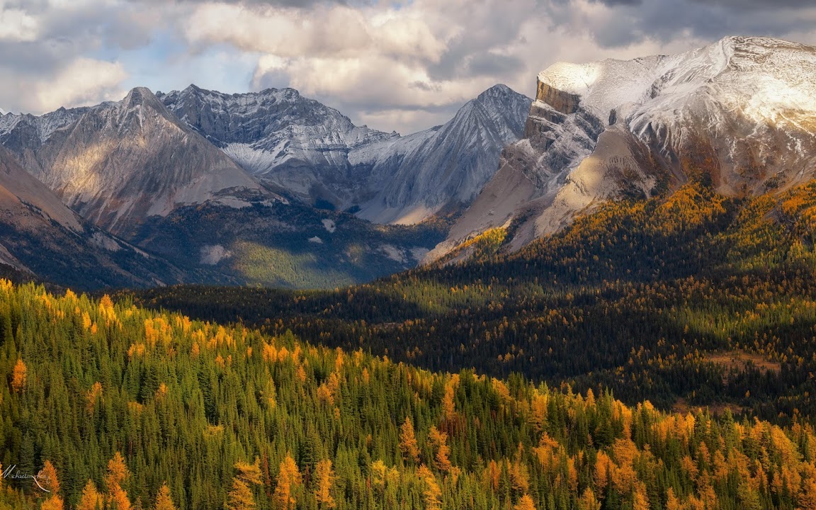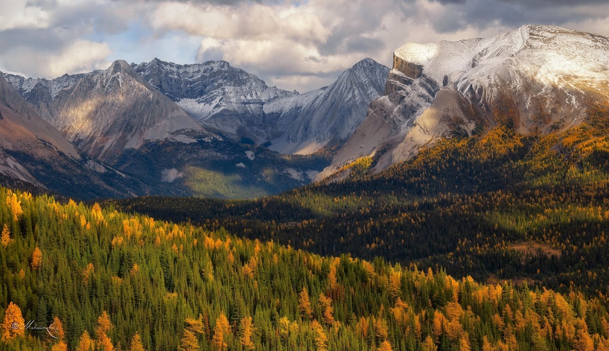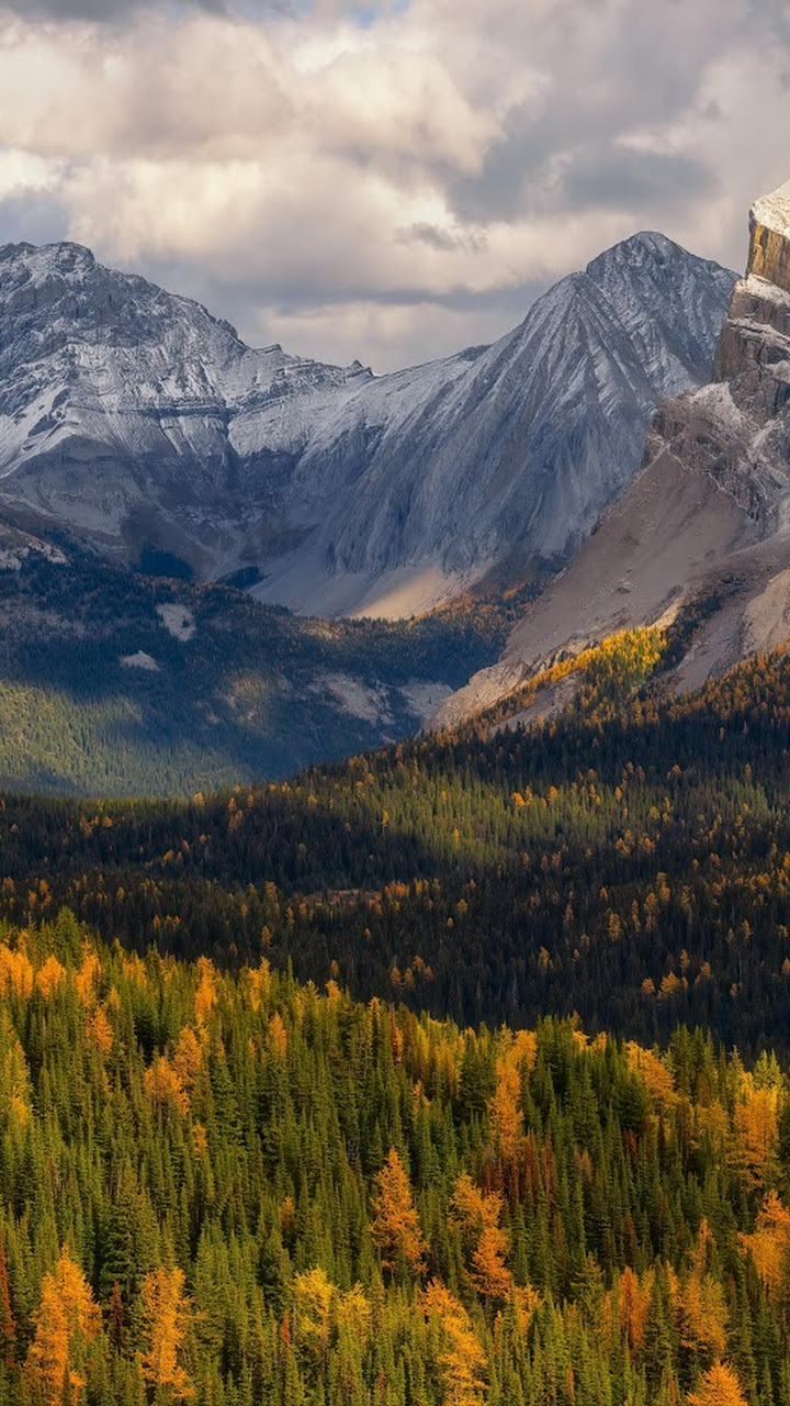 Snow-capped mountain peaks rise sharply above a massive forest valley showing brilliant golden autumn foliage under dramatic, cloudy skies.