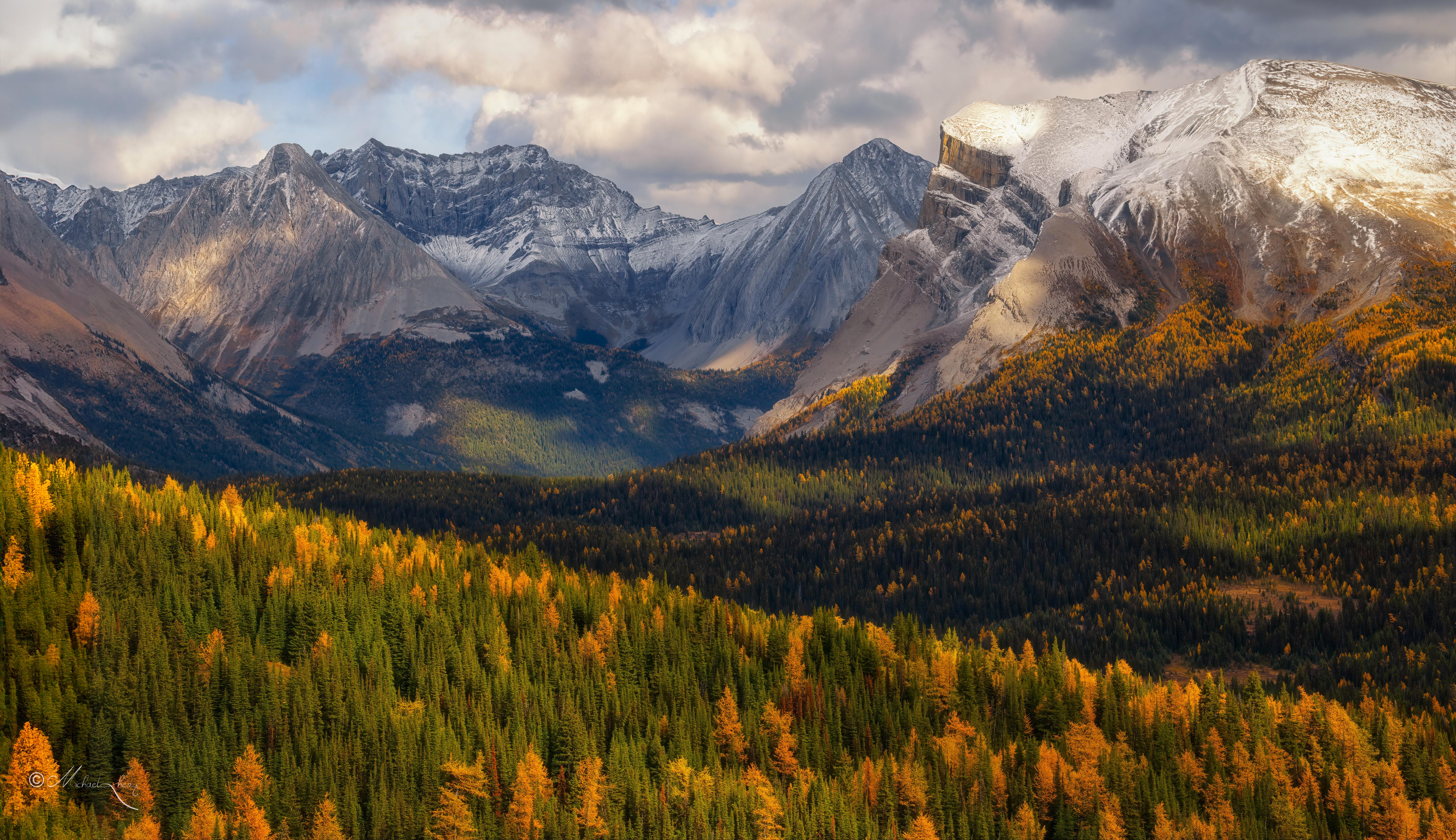 Golden Larch Mountain Valley 5K Desktop Wallpaper