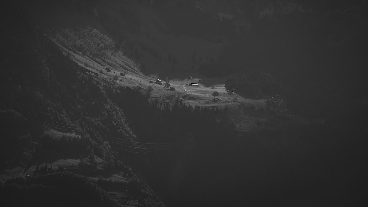 A remote alpine hamlet is sitting deep in a dark mountain valley with dramatic monochrome lighting highlighting the few small buildings.