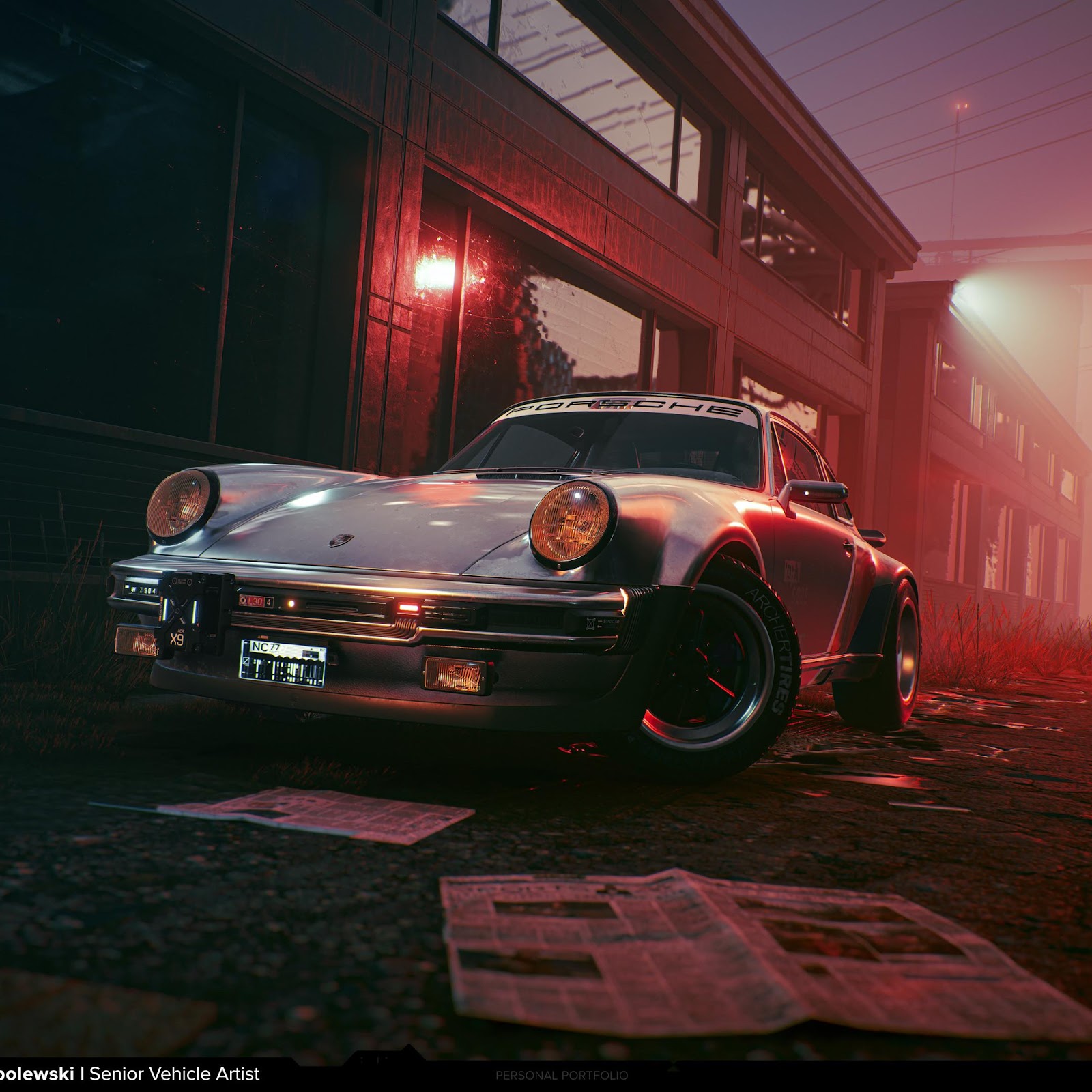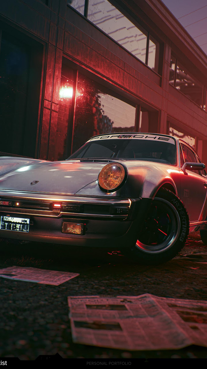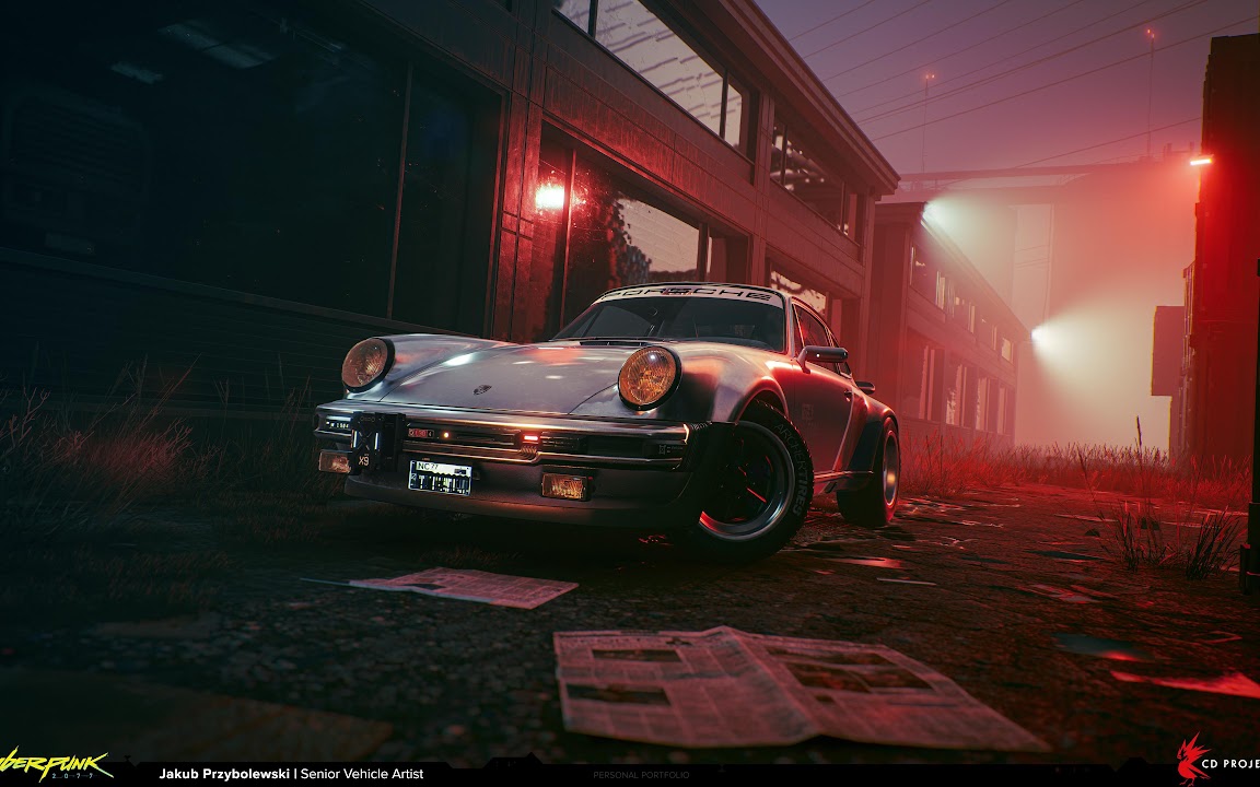 Johnny Silverhand's Porsche 911 is parked in a dirty, red-lit alley in Night City showing a strong neo-noir vibe.