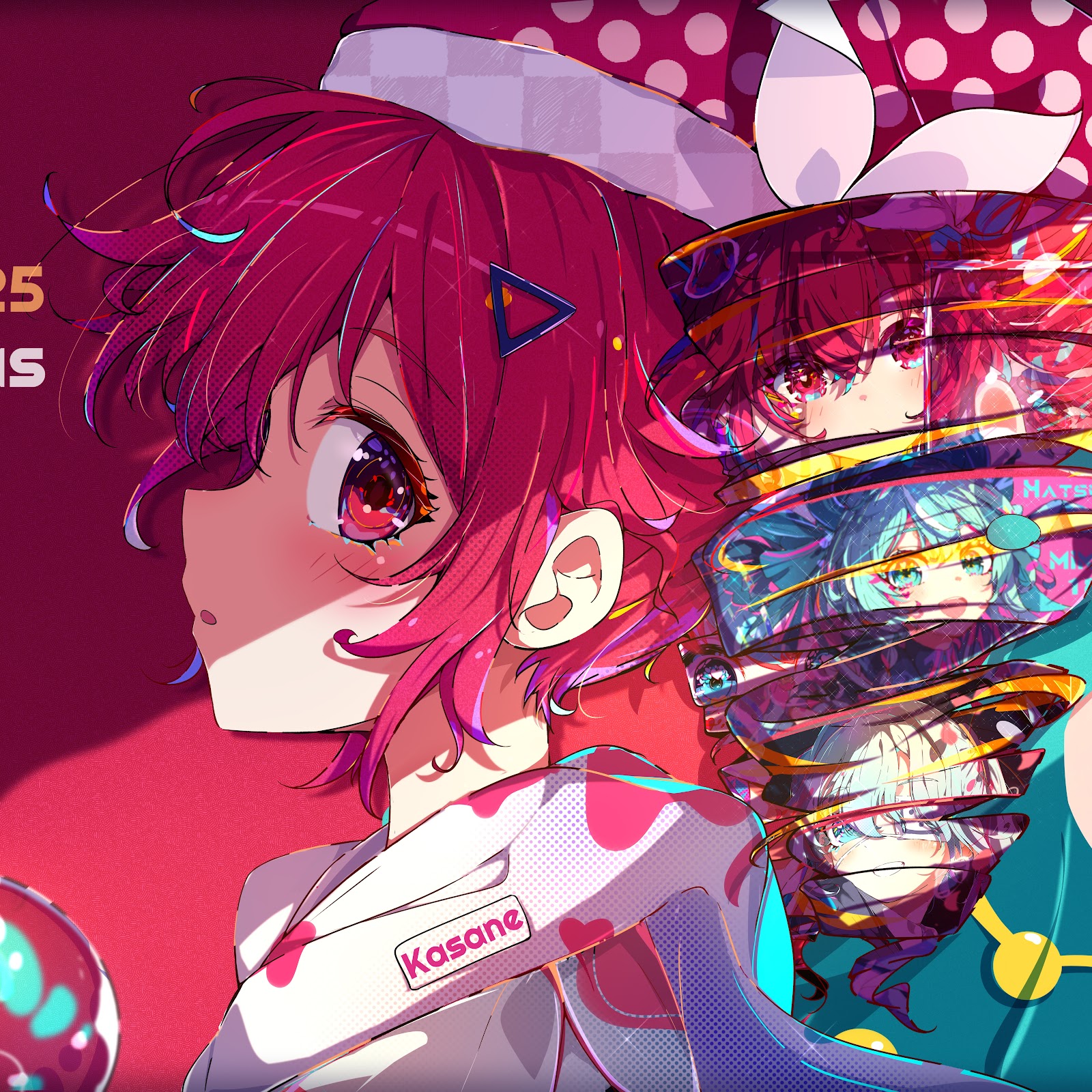 Teto Kasane wears a Santa hat with intense pink hair next to a stack of mirrored characters showing off a vibrant Christmas style.