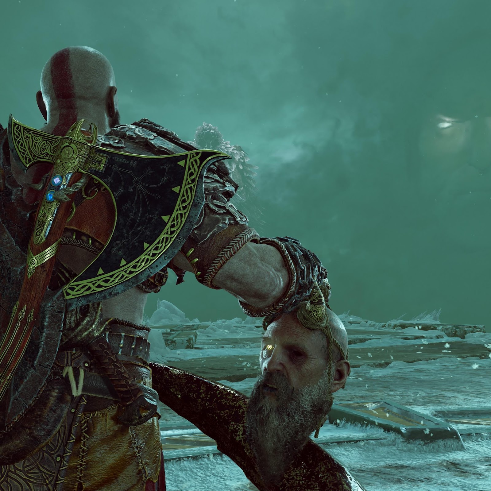 Kratos stands with Mimir's head in a snowy teal landscape looking up at a giant face in the mystical fog.