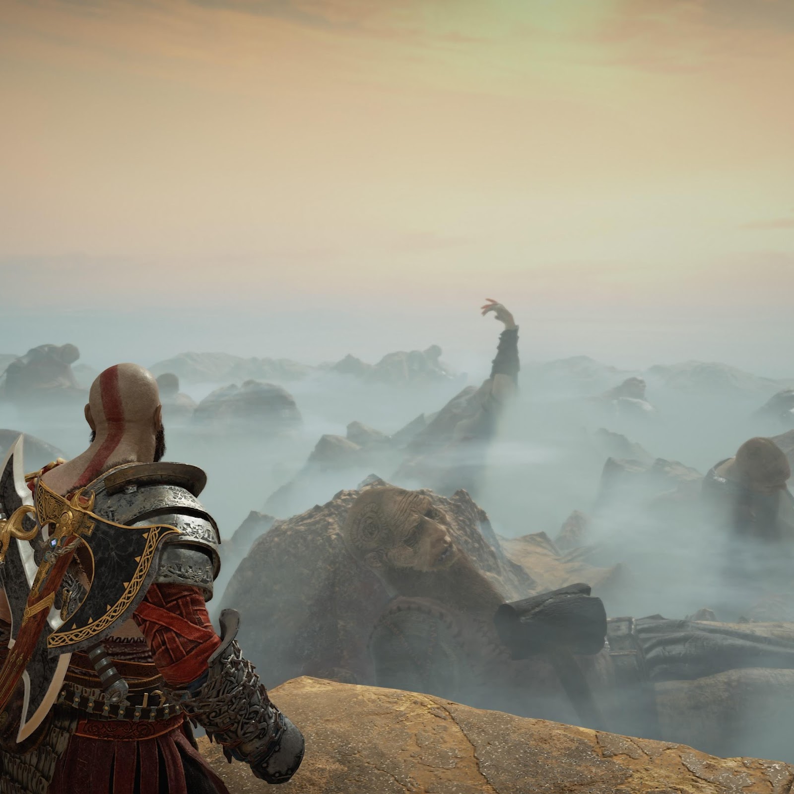 Kratos from God of War stands on a cliff looking down at giant figures covered in mist with a dramatic orange sky.