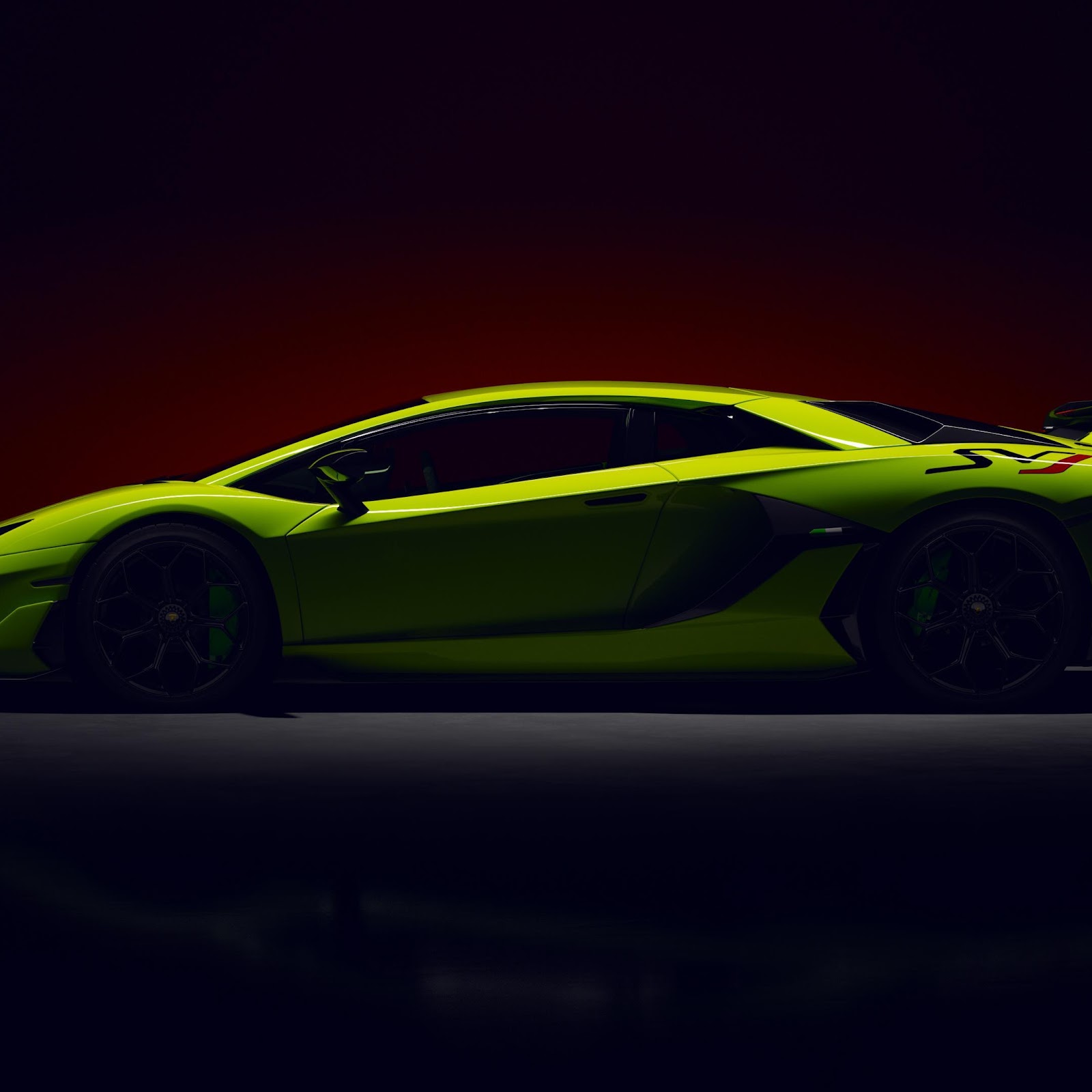 The striking Lamborghini Aventador SV, painted bright fluorescent green, is captured side-on in a dramatic, low-key studio lighting setup.