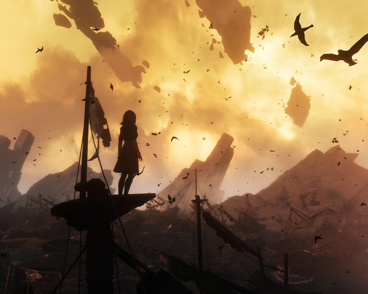 A mysterious figure stands on a broken ship mast overlooking a massive graveyard of wrecked vessels under a dramatic golden sky.