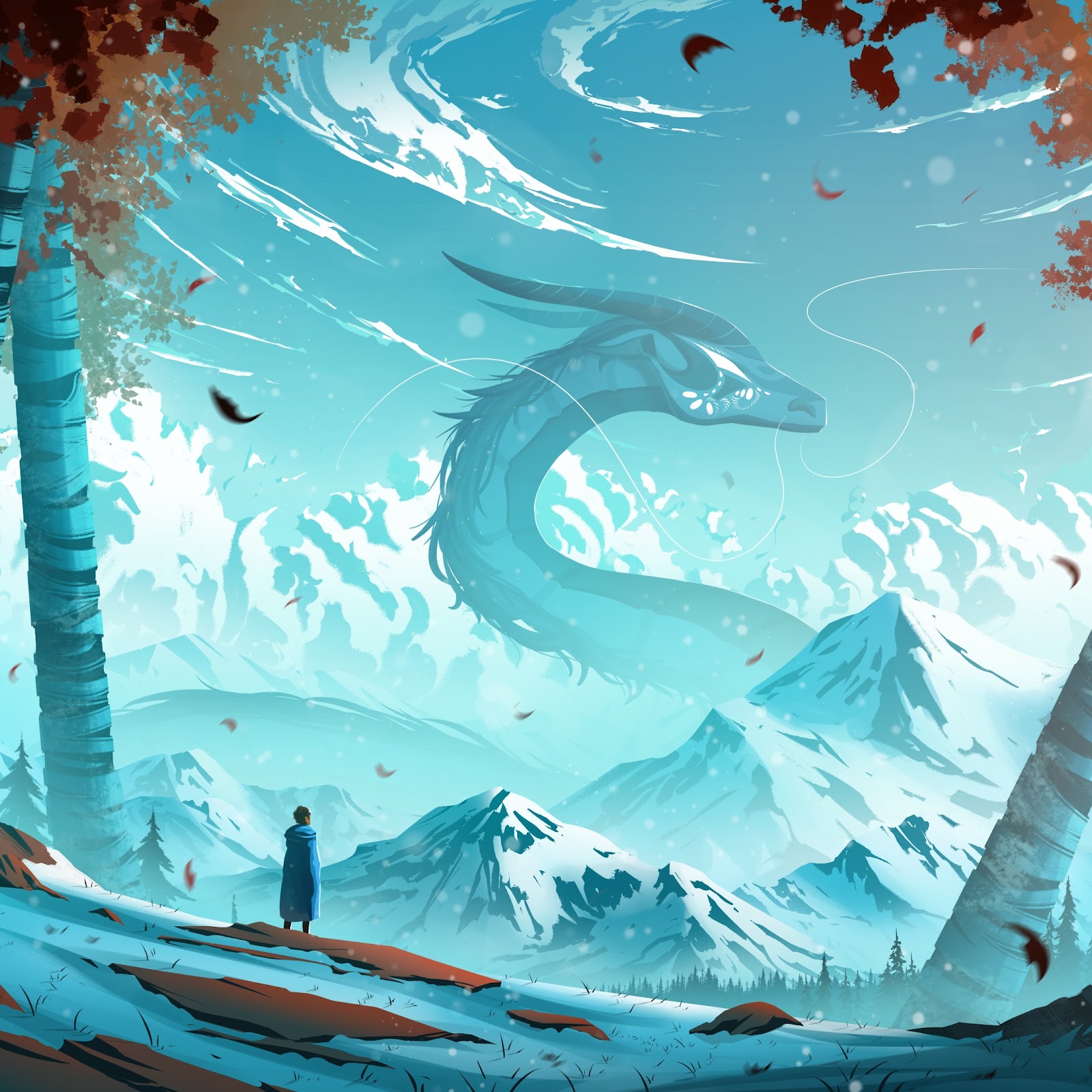 A lone cloaked figure stands on a snowy hill looking up at a massive blue spirit dragon above the icy mountains.