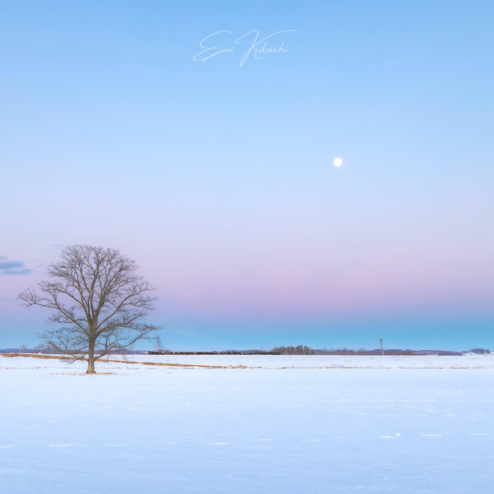 A solitary bare tree stands in a wide, snow-covered field under a soft twilight sky showing gentle blue and pink color gradients.