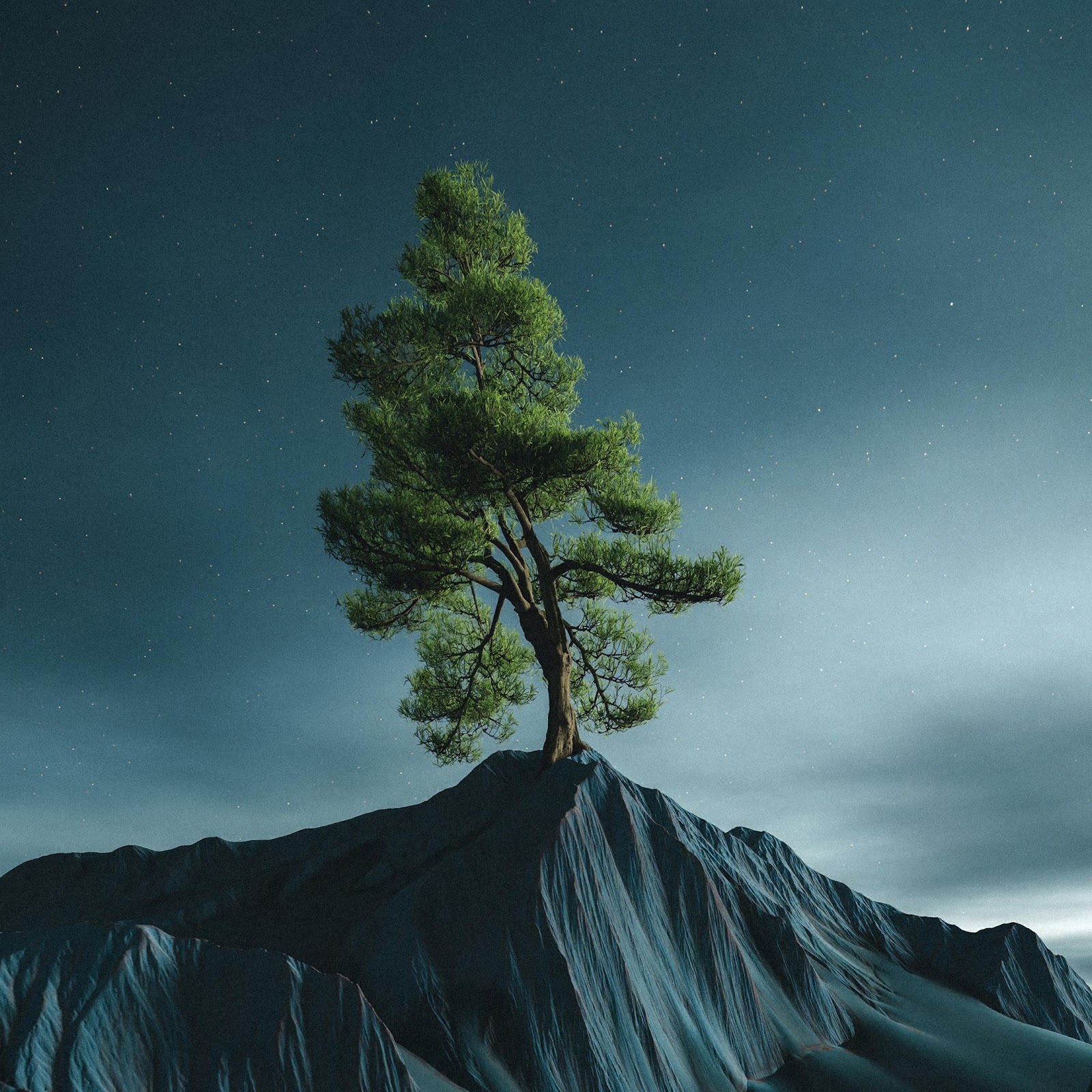 A rugged pine tree stands strongly on a sharp mountain peak under a vast, star-filled night sky.